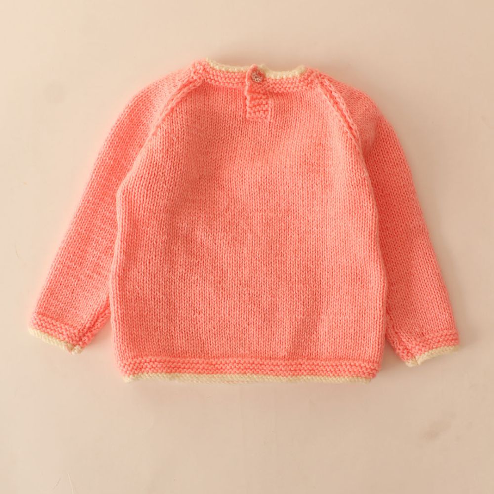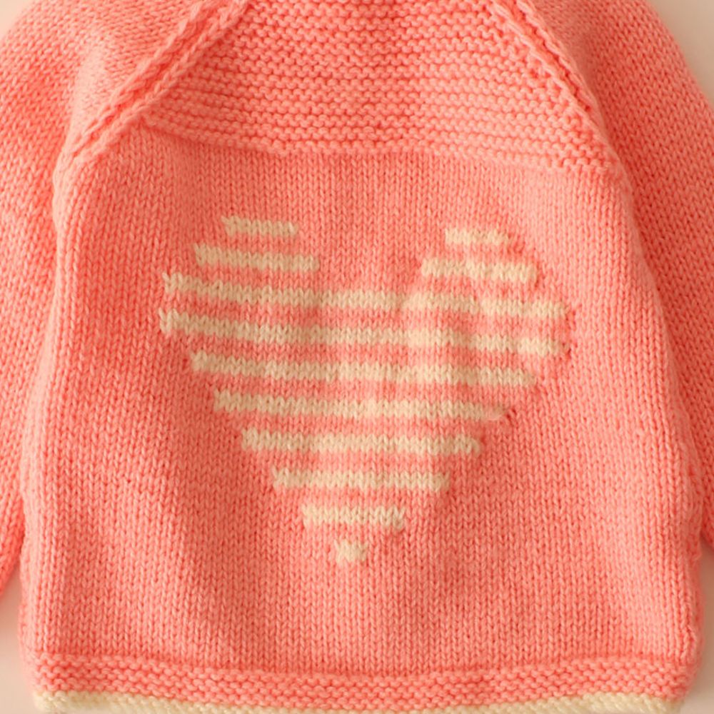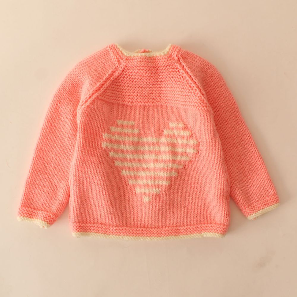 The sweater is a soft pastel pink, perfect for little ones.Overall, this sweater combines simplicity with a heartwarming design, perfect for keeping your little one snug and stylish. Color: The sweater is a soft pastel pink, perfect for little ones.