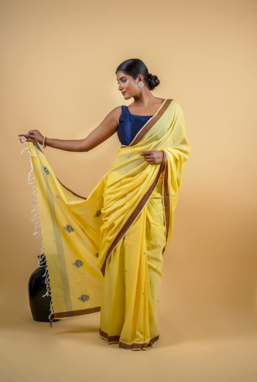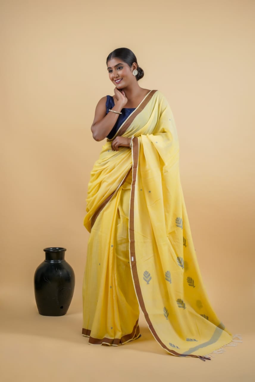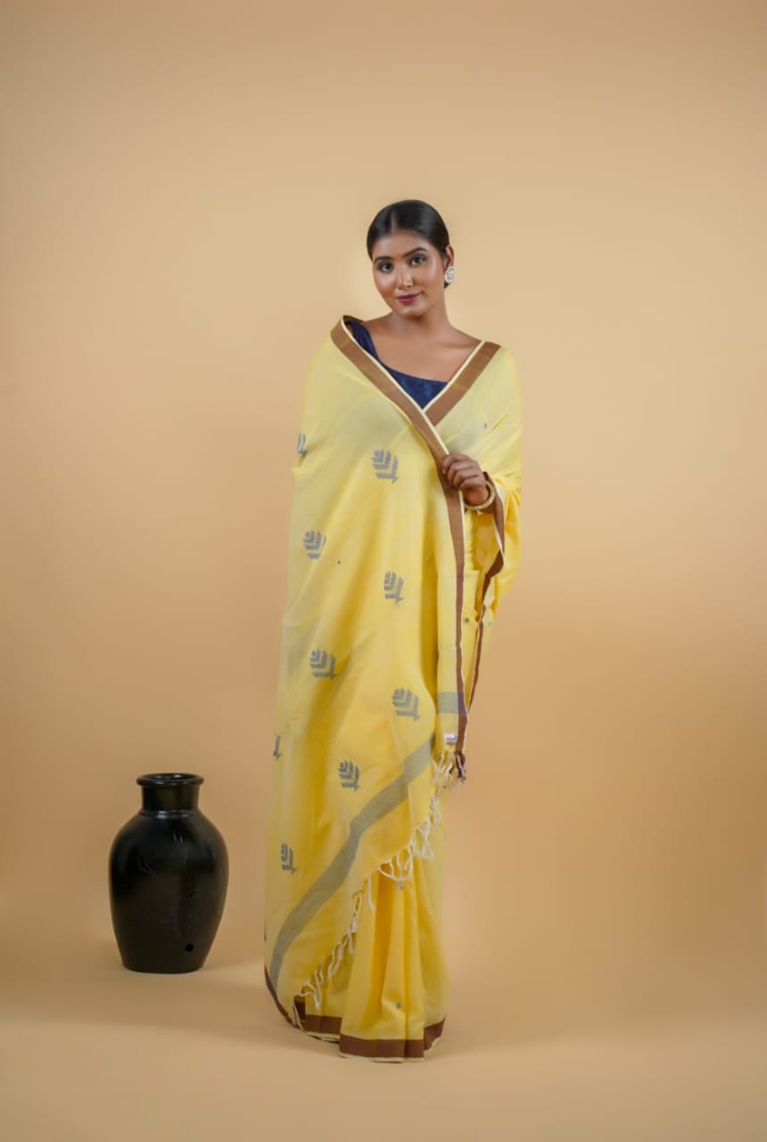 Infuse your wardrobe with warmth and tradition through this Light Yellow Handloom Cotton Saree, adorned with the elegant Bawan Buti design. Known for its intricate geometric motifs, the Bawan Buti weave brings a sense of heritage and artisanal detail to this saree. Crafted from premium handloom cotton, it offers a lightweight, breathable, and comfortable drape that’s ideal for all-day wear.