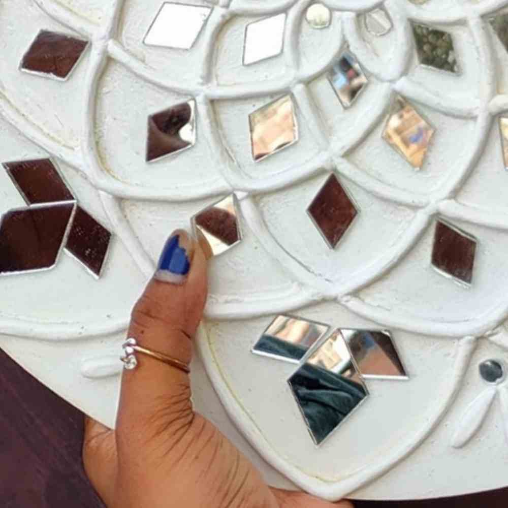 Crafted with care by skilled artisans, this mirror is made using eco-friendly materials, ensuring both quality and sustainability. The delicate detailing in white clay and mirror work reflects the cultural heritage of Gujarat's Lippan art, making it a must-have piece for art lovers and decor enthusiasts.