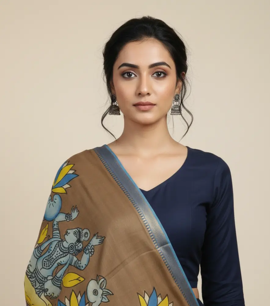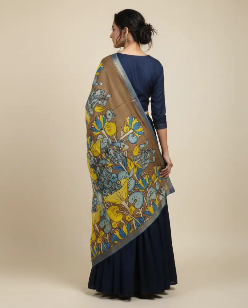 This Kalamkari silk dupatta is handcrafted by skilled artisans using traditional hand-drawn and dyed techniques. The cocoa brown base is alive with vibrant floral motifs in indigo and mustard tones, framed by a subtle border. Each piece is created slowly, preserving centuries-old storytelling craft and artisanal precision.