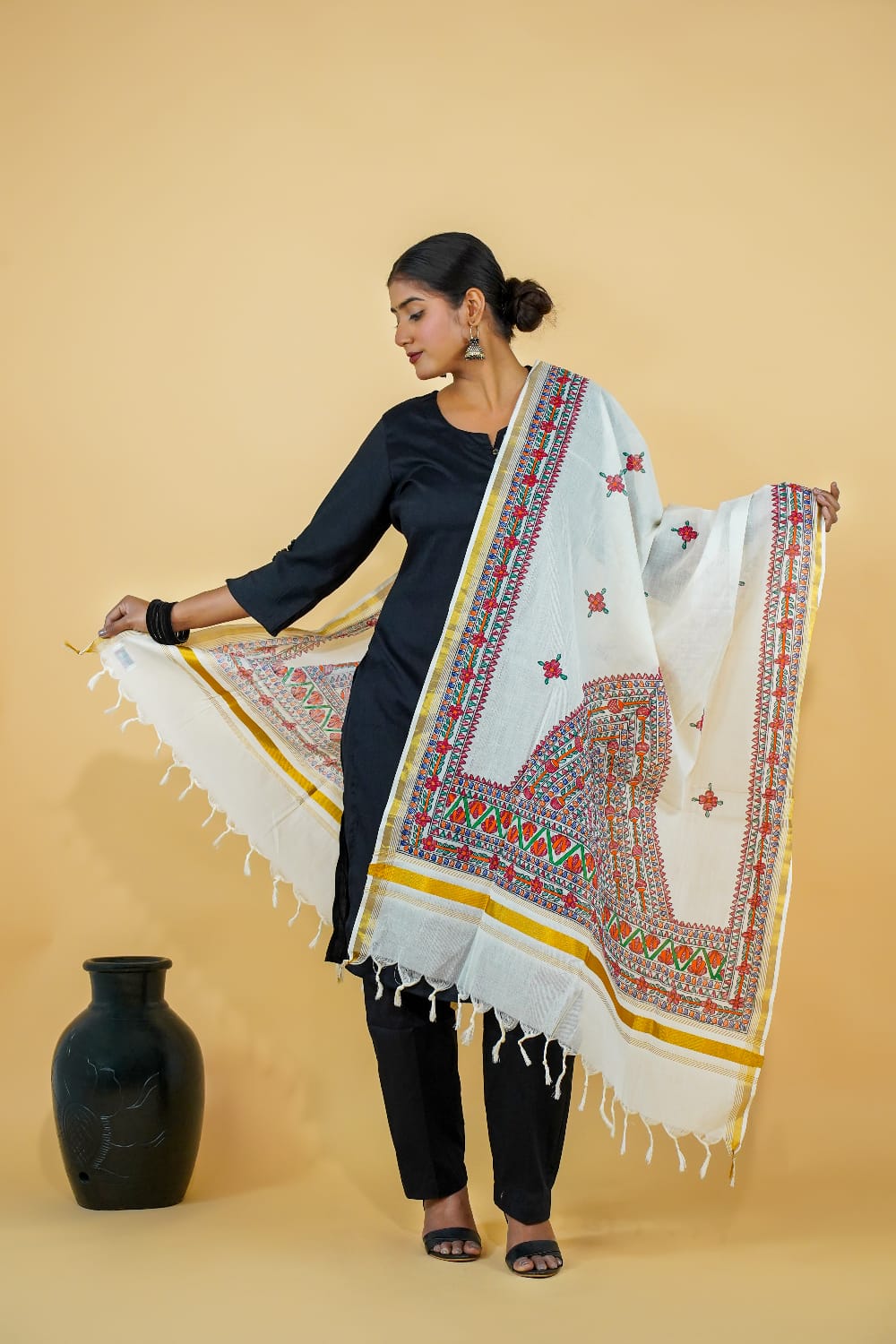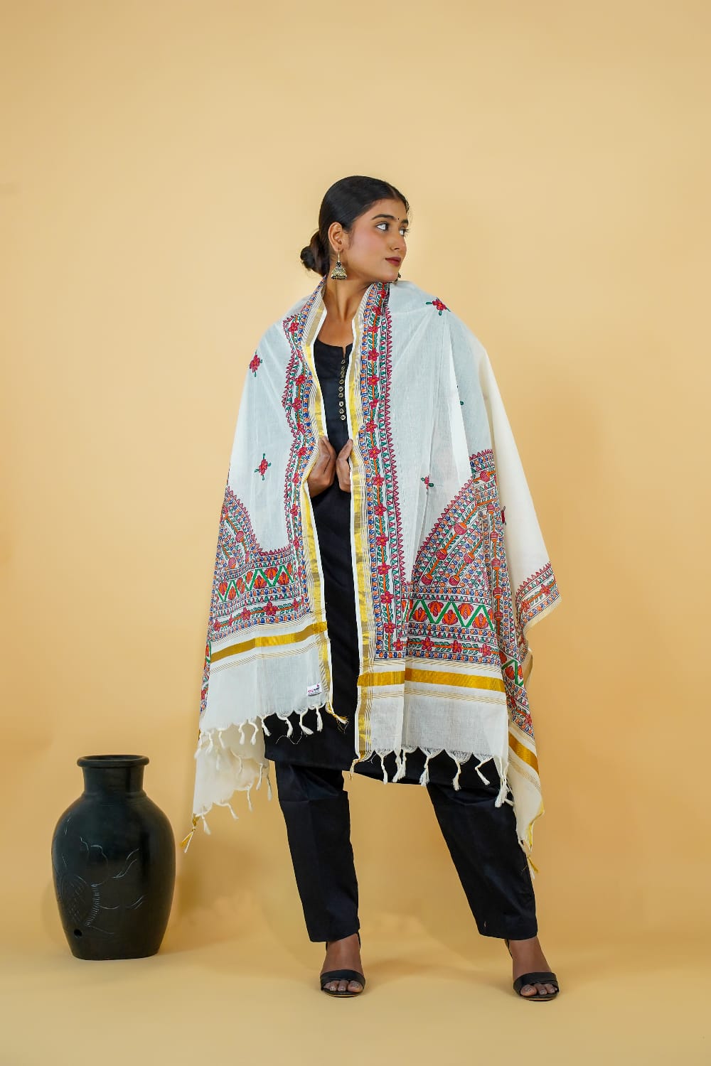 Madhubani Painting Kerala Cotton Dupatta – Handmade | Handpainted