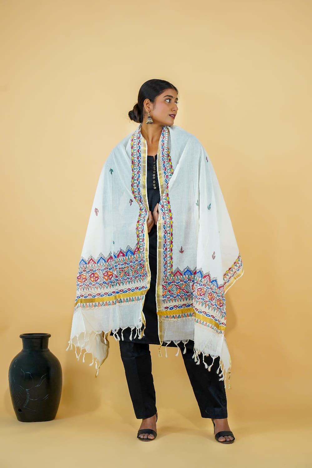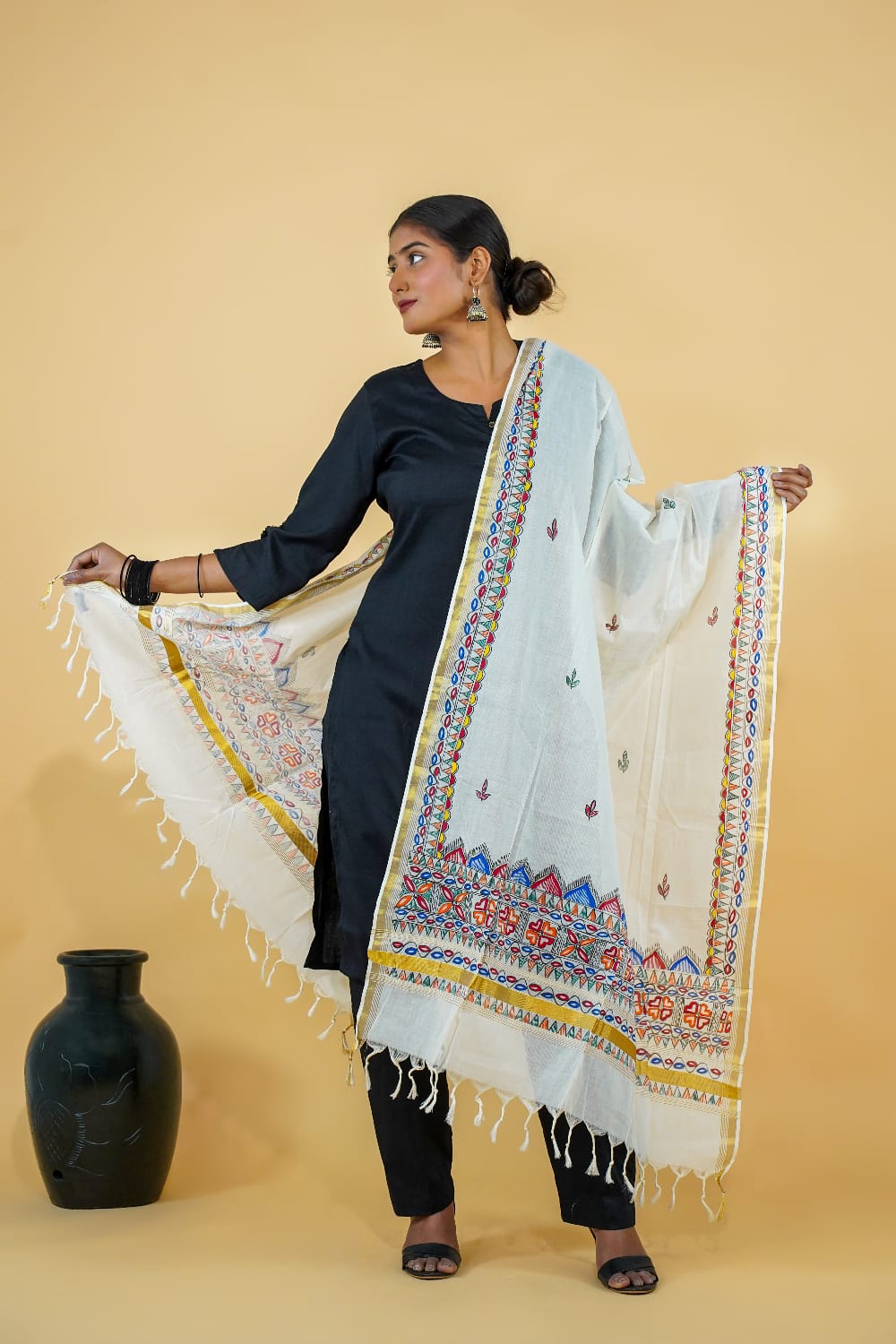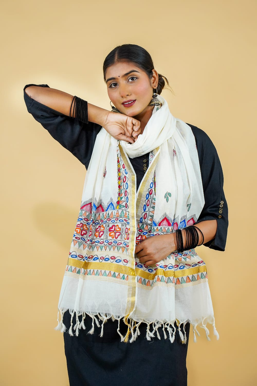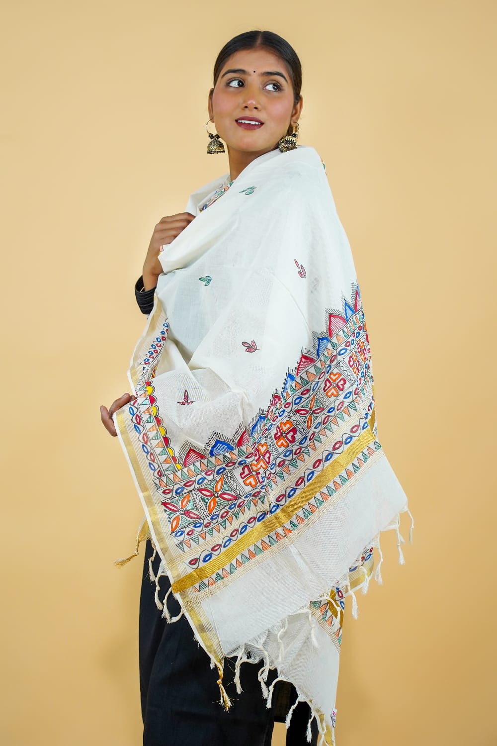 This elegant white dupatta crafted in pure Kerala cotton showcases the vibrant Hand madhubani painting From Bihar. The meticulous handwork, featuring geometric and floral patterns, adds a pop of color to the soft base. Finished with classic tassels and a golden border, this handmade piece is perfect for women who love ethnic simplicity blended with artistic finesse.
