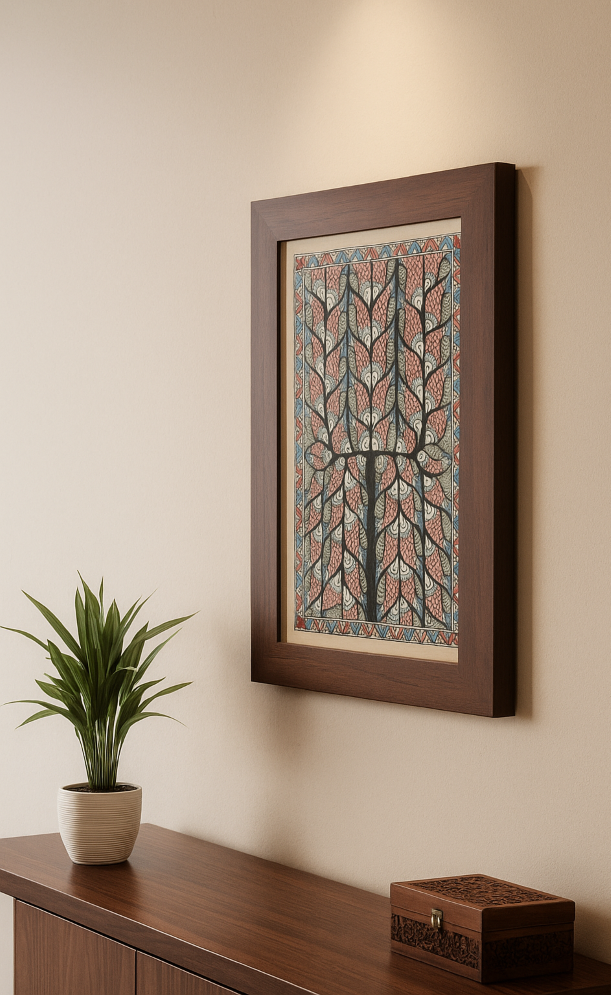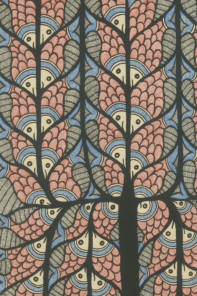 This beautiful Madhubani painting represents the sacred Tree of Life, intricately designed with fish motifs a traditional symbol of fertility, prosperity, and harmony in Mithila art. Each branch and leaf in the artwork is detailed with stunning hand-drawn fish patterns, creating a mesmerizing visual of balance between nature and life. Handcrafted on high-quality canvas paper, this artwork showcases the true spirit of Bihar’s Mithila tradition, combining fine black linework with soothing shades of red, blue, and cream. The detailed borders enhance its ethnic charm, making it an ideal choice for home décor, art collections, or as a meaningful gift symbolizing growth and positivity.