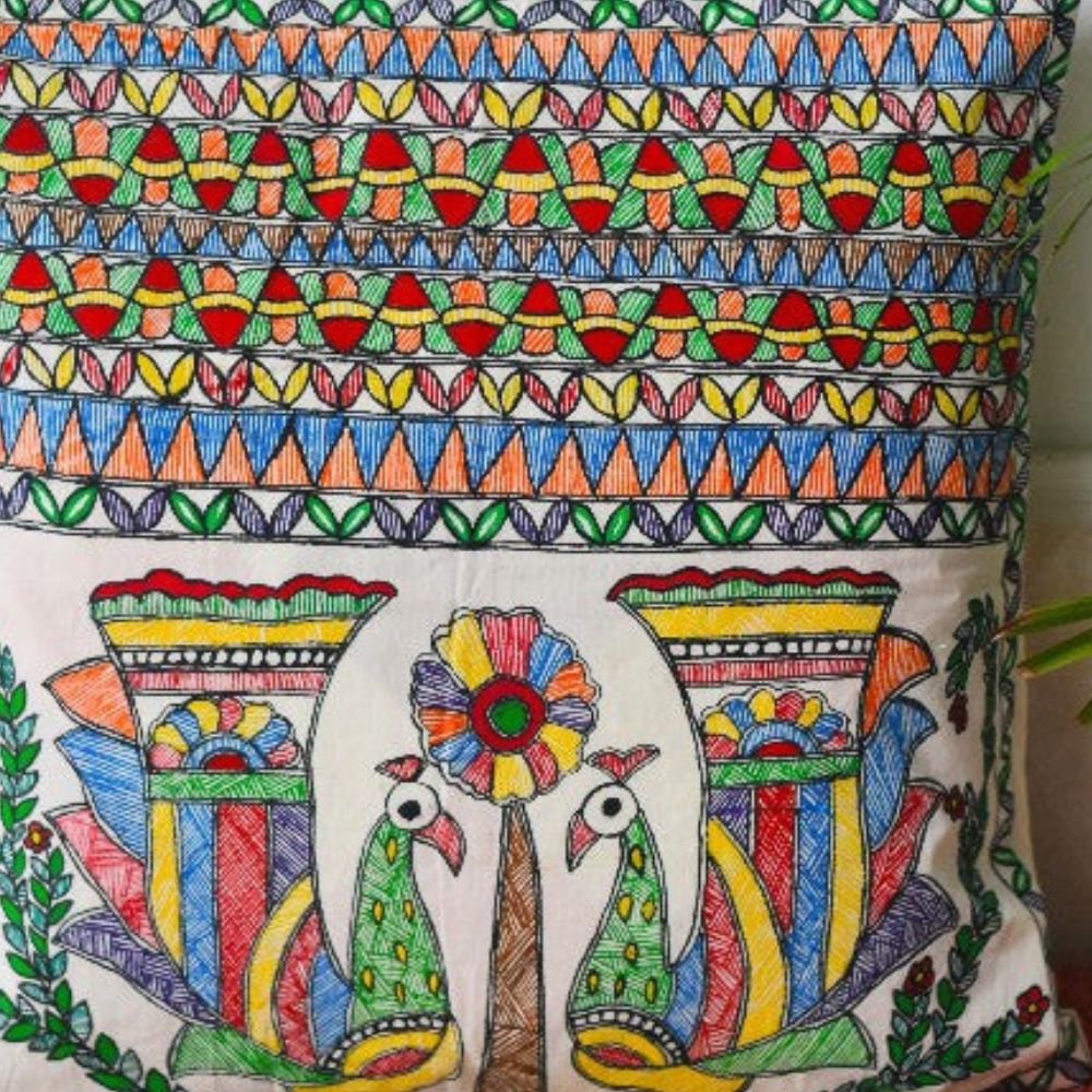 • Hand-painted Madhubani art: Each cushion showcases an authentic hand-painted peacock perched on a tree, with intricate patterns and vivid colors that are a hallmark of Madhubani craftsmanship.