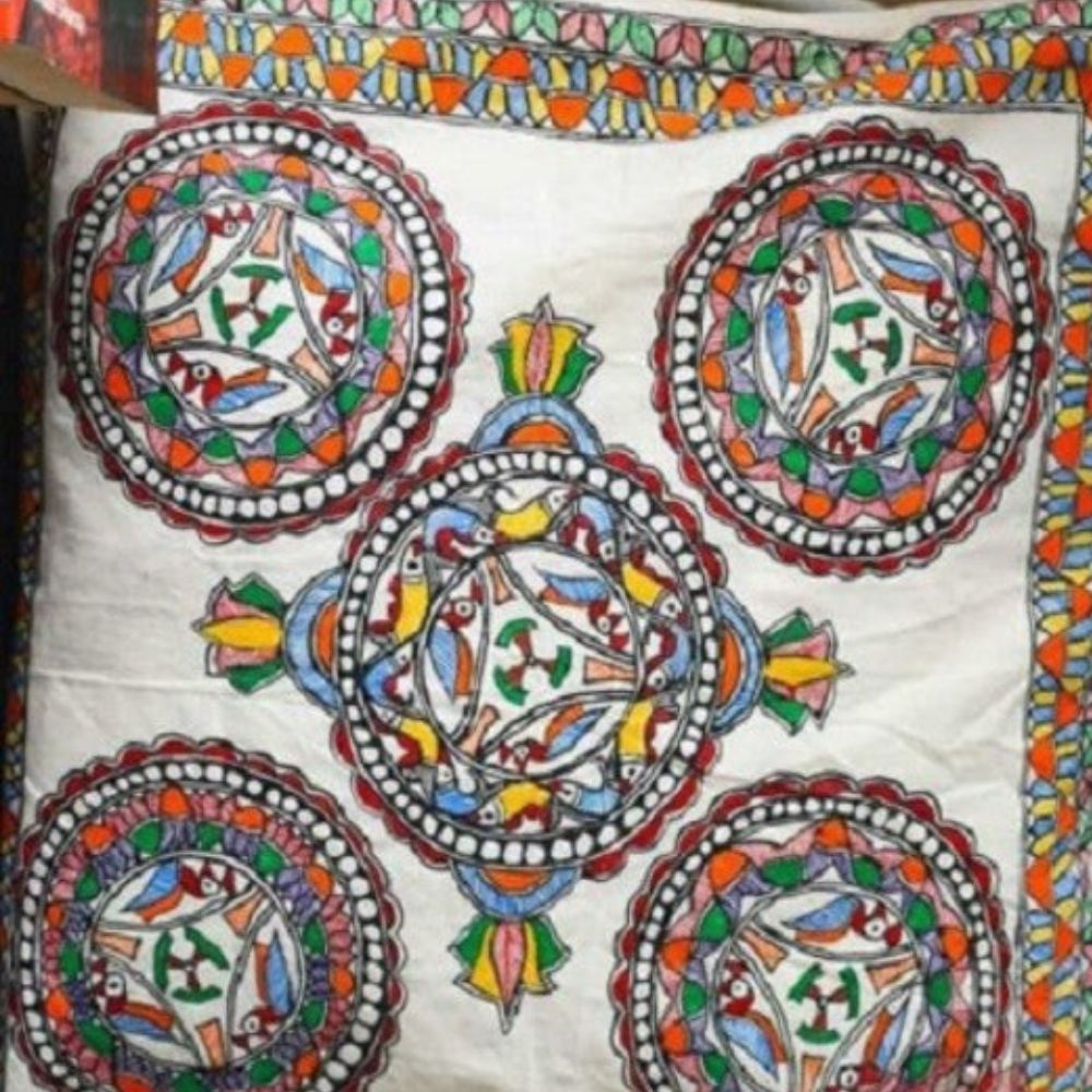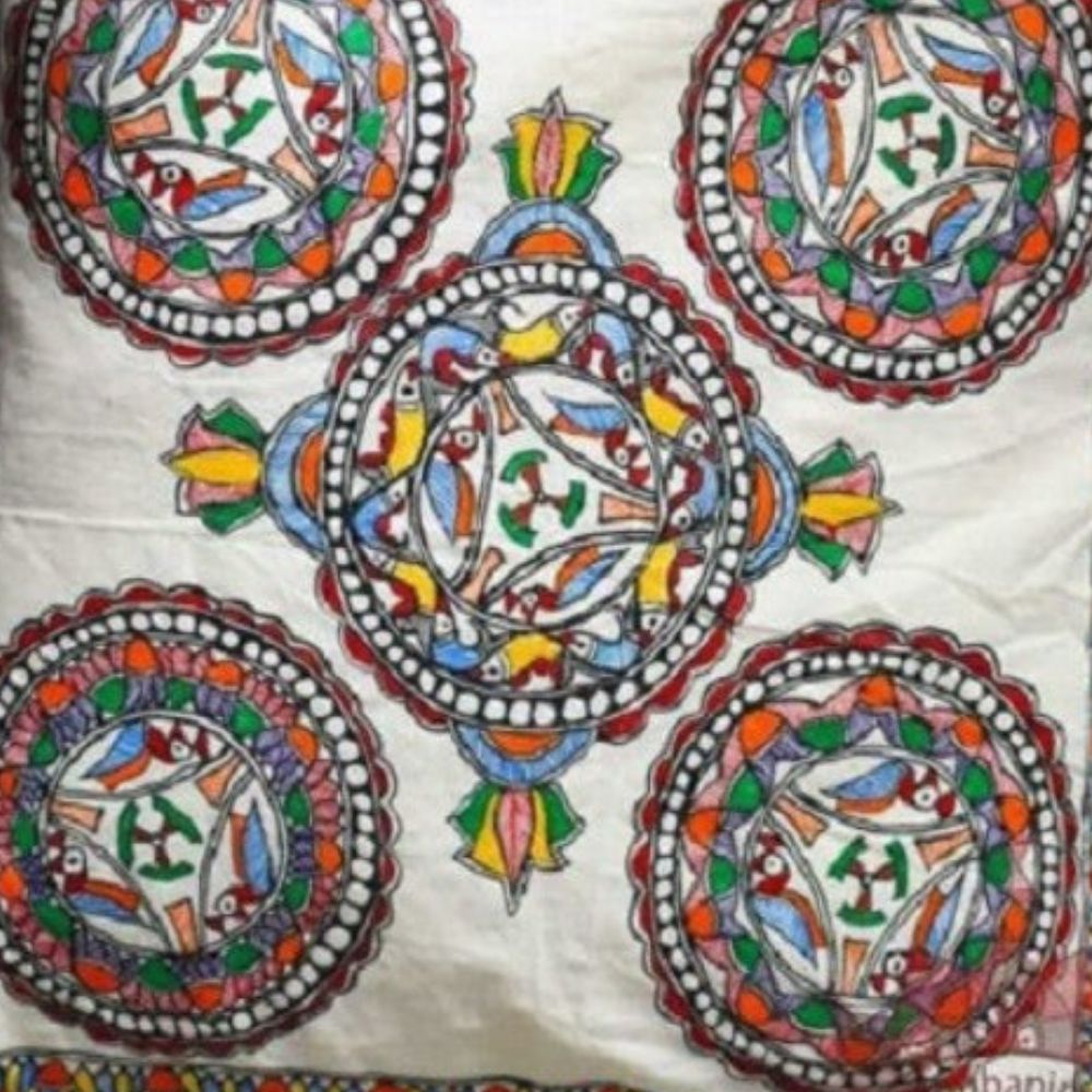 • Hand-painted Madhubani design: Each cushion is carefully hand-painted by artisans, showcasing the detailed Prakriti design, with elements such as flowers, trees, and animals in a lively, harmonious arrangement.