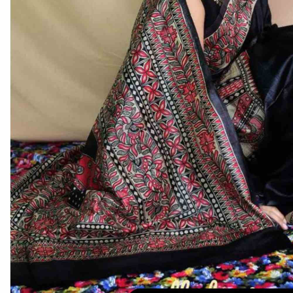 Buy Madhubani Painting Tussar Silk saree will enhance the beauty of your wardrobe. The floral painting is so beautiful and black colour is always favourtie colour for ladies in saree category. Product included with Blouse Pc .The sarees exude elegance and are perfect for special occasions. This saree collection has sarees that are rare to find, the saree that is part of the collection has been handpicked.