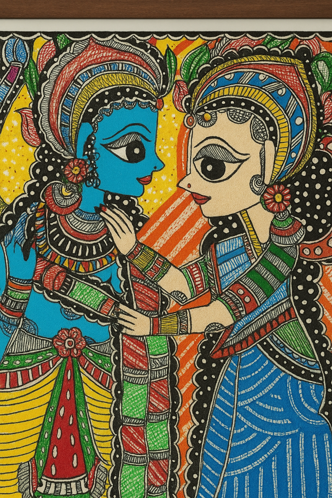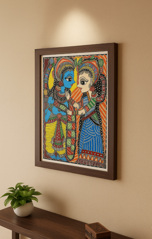 This enchanting Madhubani painting portrays the eternal love between Lord Krishna and Radha, a symbol of divine connection and devotion. Crafted with delicate handwork on premium canvas paper, this piece reflects the rich tradition of Mithila folk art from Bihar, India. The artwork bursts with vibrant shades of blue, yellow, red, green, and orange, capturing the emotions and beauty of Radha-Krishna’s bond. Intricate borders, detailed attire, and expressive eyes bring the figures to life making this painting a true masterpiece of traditional Indian artistry. Perfect for decorating your home, office, or gifting on festive occasions, this artwork adds both spiritual depth and cultural elegance to any wall.