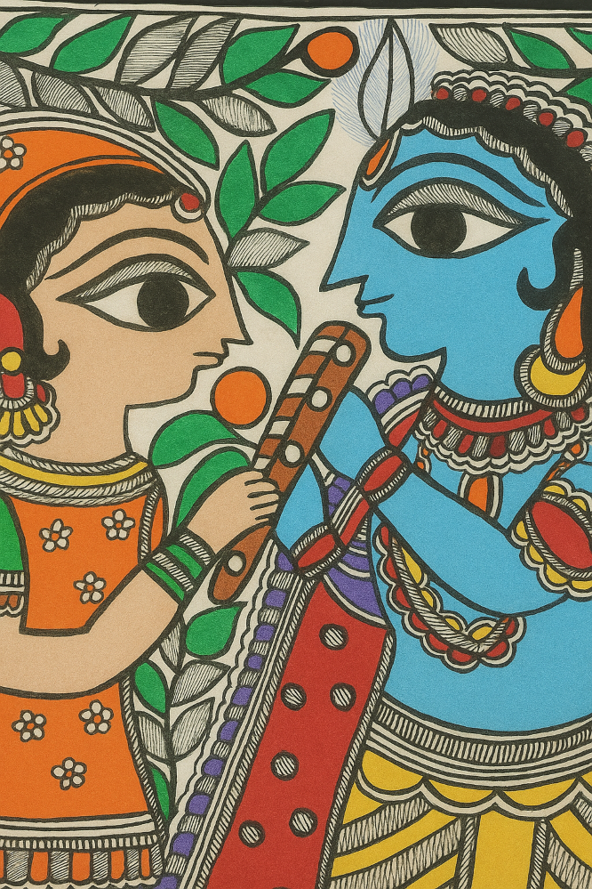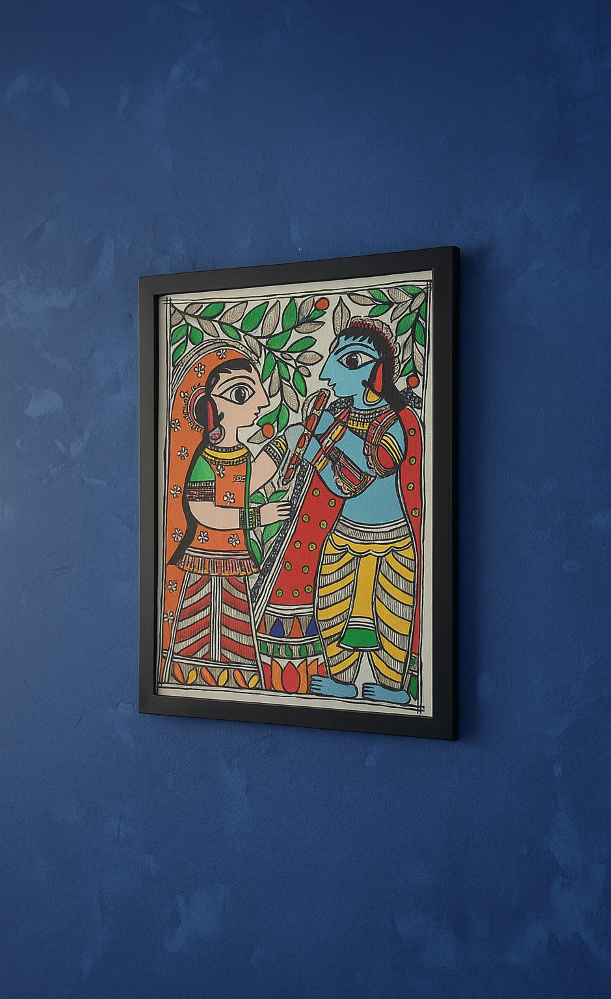 Living rooms | Art galleries | Cultural décor spaces | Traditional gifts | Festivals & celebrations Bright and beautiful Madhubani painting hand-painted on premium Canva paper. This artwork depicts a divine Indian couple in vibrant colours red, blue, yellow, orange, and green — representing love and devotion. Each stroke reflects the cultural richness of Mithila art with intricate detailing and fine black outlines.