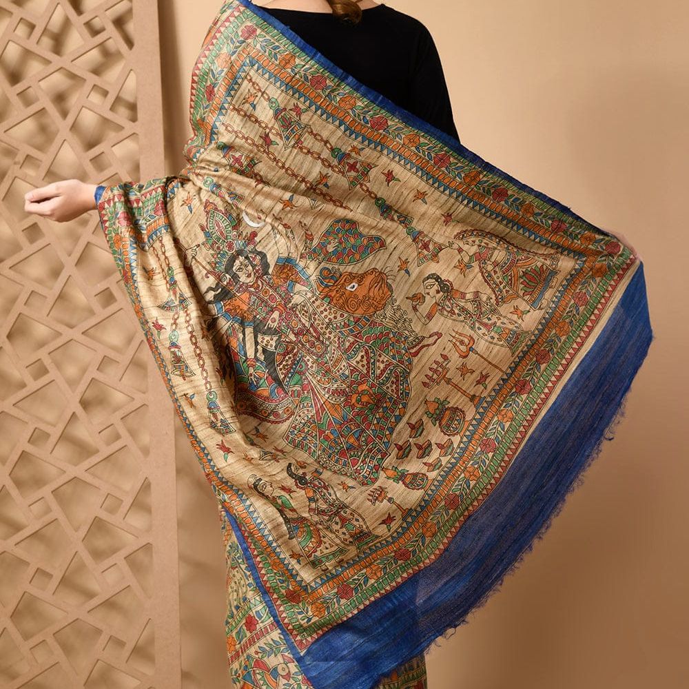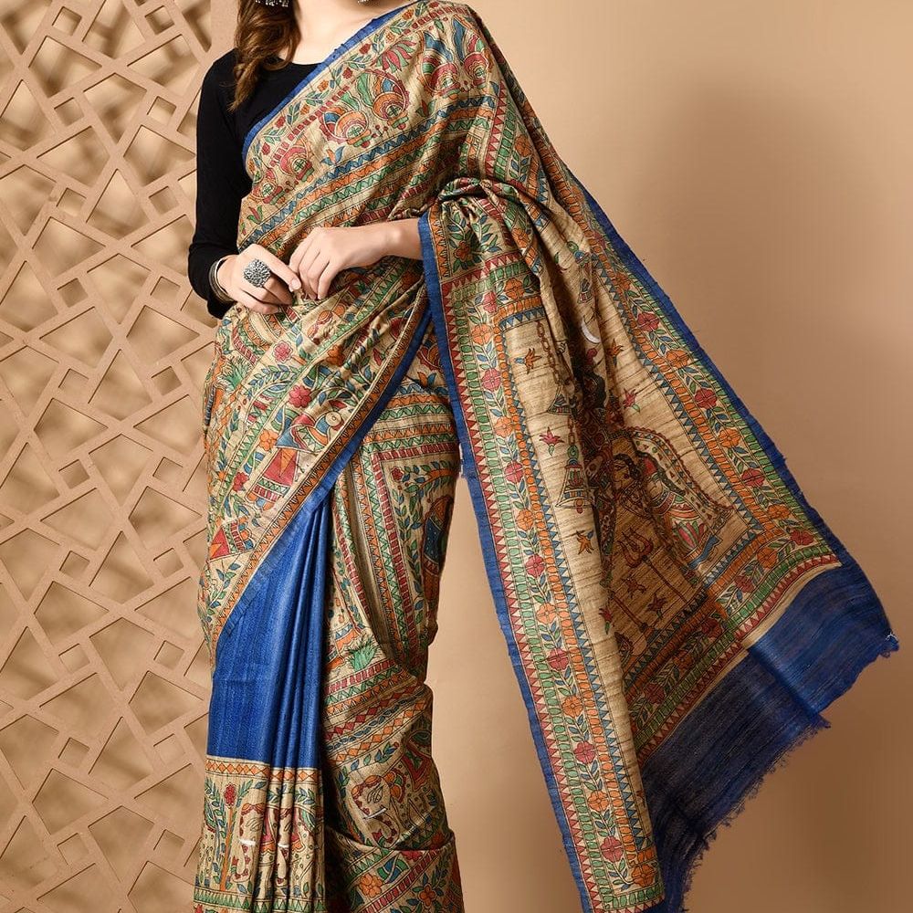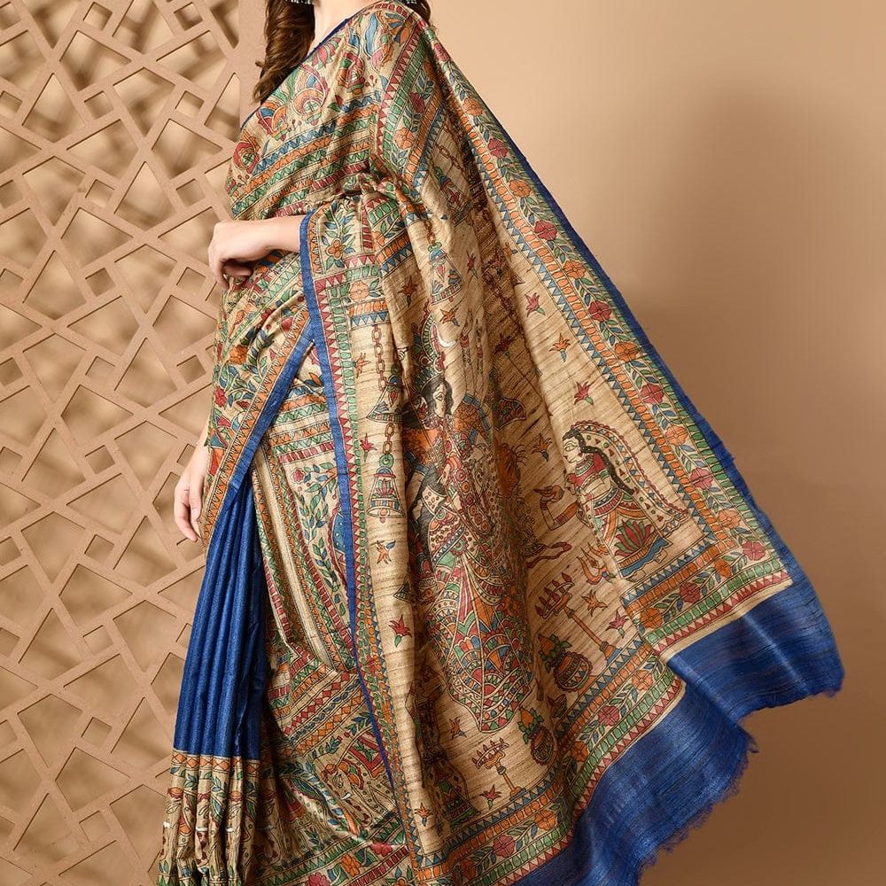Handcrafted Madhubani Tussar Silk Blue Colour Saree