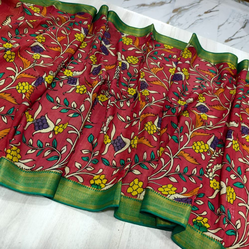 Maroon Saree Floral Handprint Kalamkari Dupatta with Bangalore Silk