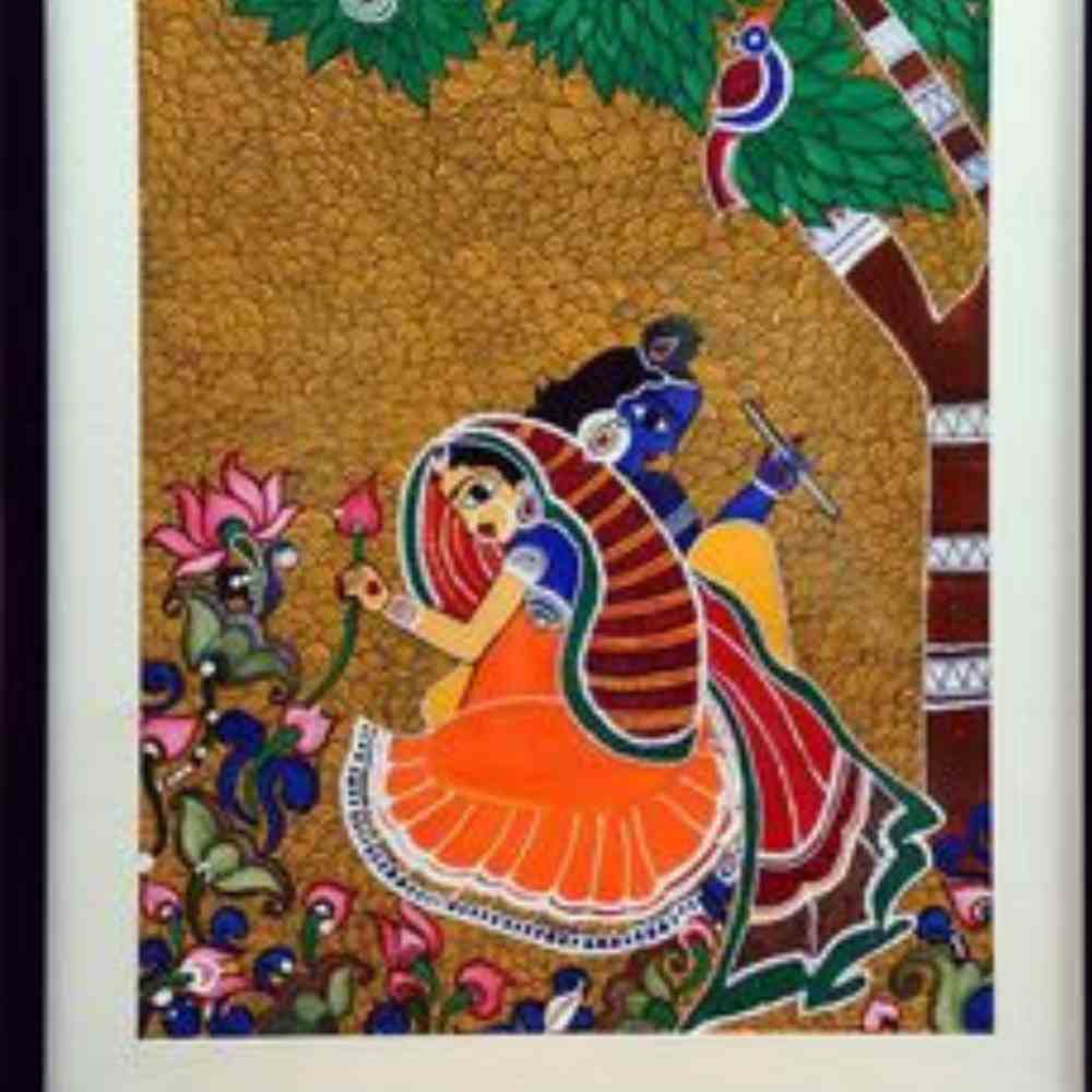 Transport yourself to the divine realm of love and music with our enchanting Madhubani painting featuring Radha and Krishna, adorned with a basuri (flute), surrounded by a vibrant tree and playful bird. Handcrafted by skilled artisans from the Mithila region of India, this artwork captures the timeless romance and celestial harmony of Hindu mythology.rnrnIn this intricately detailed composition, Rad