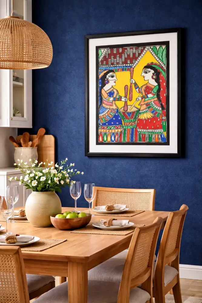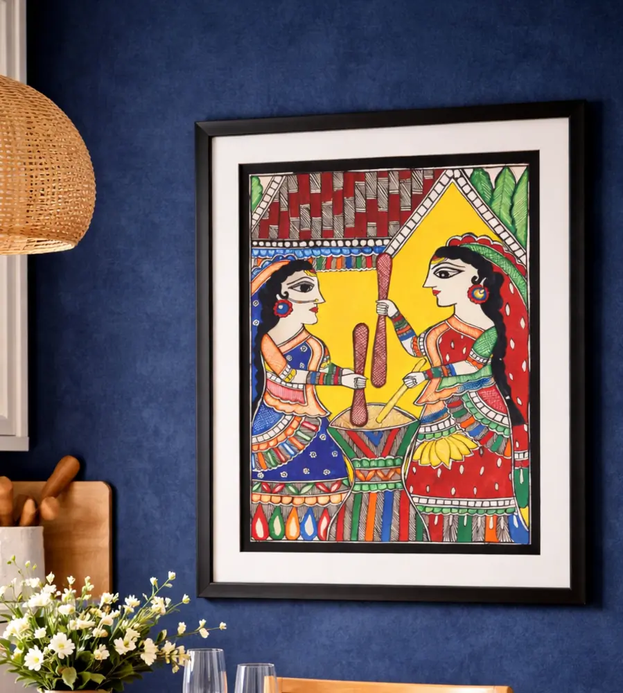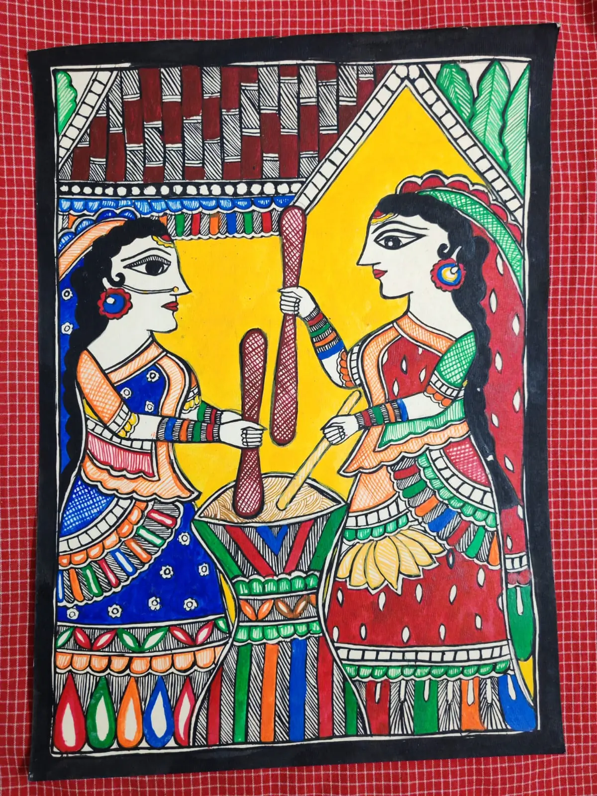 This expressive Madhubani painting portrays two women engaged in a traditional activity, symbolizing harmony, collaboration, and cultural heritage of Mithila. The intricate patterns, bold colors, and detailed attire reflect rural life and timeless traditions, making it a meaningful addition to any modern or ethnic décor setting