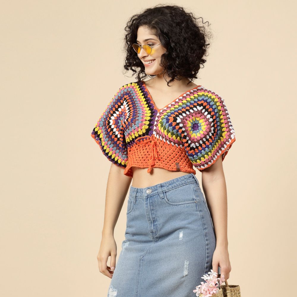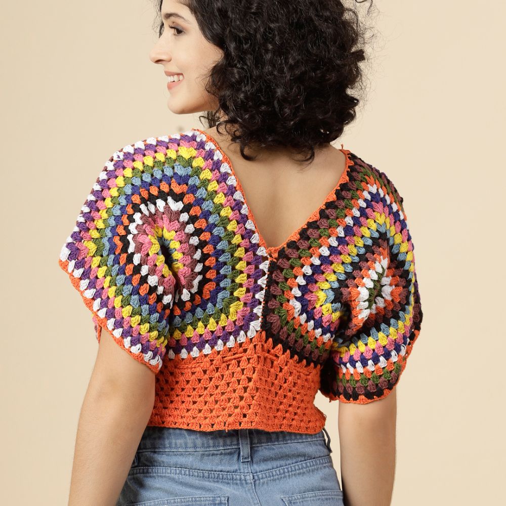 Add a splash of color and handmade charm to your wardrobe with this Multicolor Boho Crochet Crop Top — a joyful expression of creativity and craftsmanship. Featuring vibrant granny square motifs stitched together in a rainbow of hues, this top is a playful yet stylish ode to traditional crochet techniques with a modern twist.