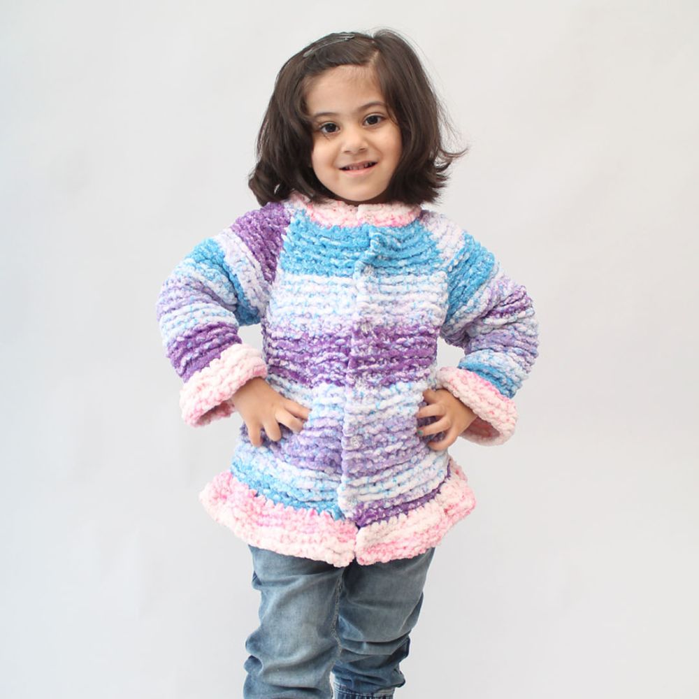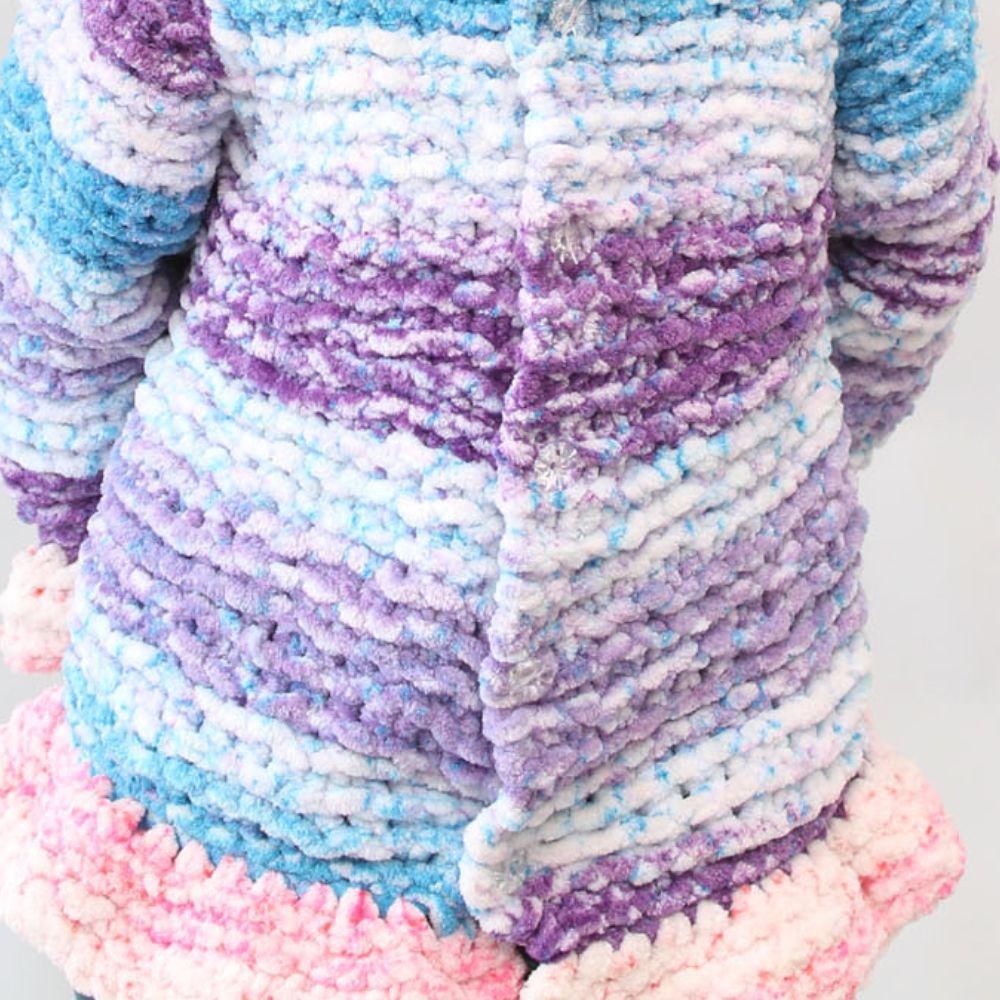 Color: The sweater features a delightful mix of shades, including blue, purple, pink, and white. These colors blend harmoniously in horizontal stripes.