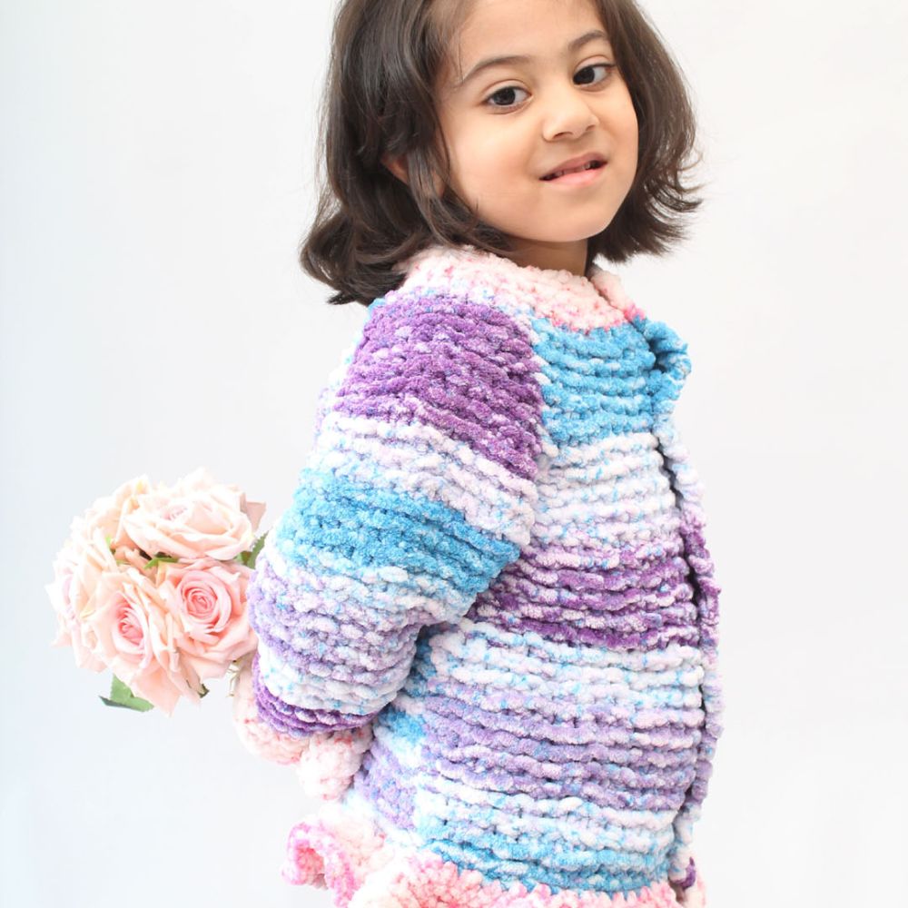 Design: The sweater features a blend of pastel colors, including shades of blue, purple, pink, and white. The pattern consists of horizontal stripes with varying thicknesses, creating a textured and visually interesting look.At the hem and cuffs, there’s a ruffled or scalloped edge in pink color, adding a playful touch to the overall design.Remember, fashion is all about expressing your personality, and this sweater seems to strike a balance between comfort and style.