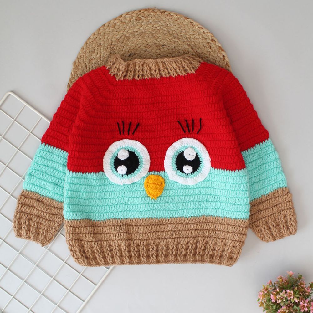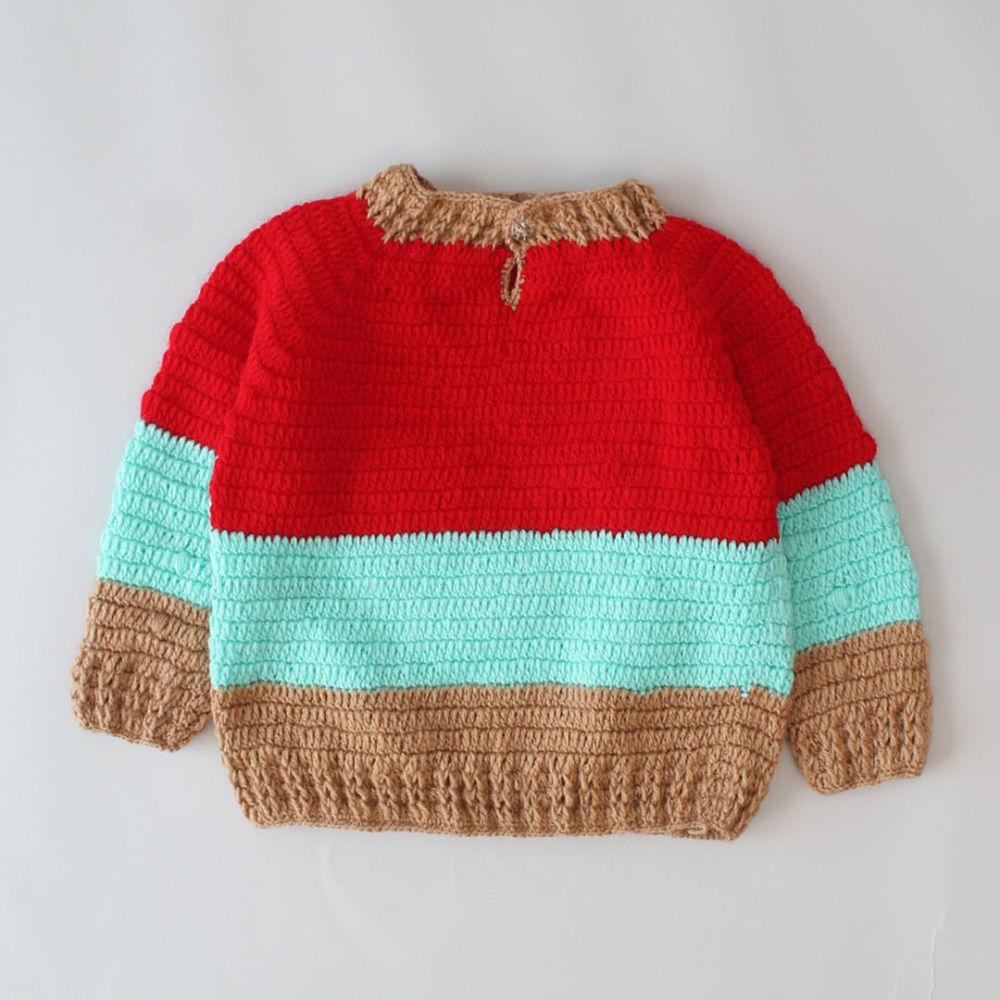 Design: The sweater features a playful and colorful design, resembling an owl. The body transitions from vibrant red at the top to bright aqua blue in the middle, with alternating horizontal stripes of aqua blue and brown at the bottom. The sleeves have wide brown cuffs that match the lower stripe pattern.This unique and creative sweater would definitely catch anyone’s eye.