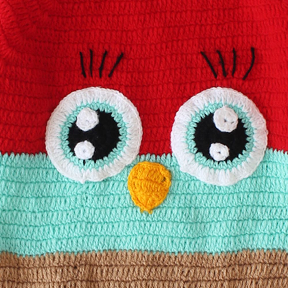 Pattern: The sweater features large white circles with black dots (representing eyes) above an orange triangular beak on the chest area, completing the owl’s face.