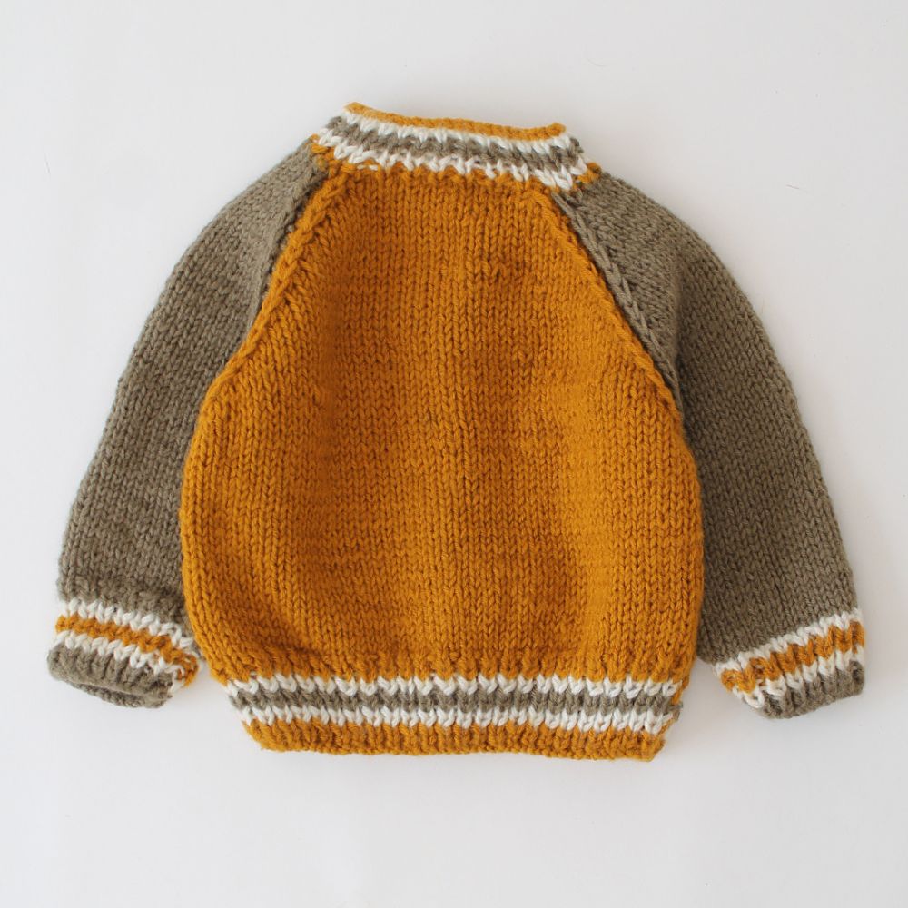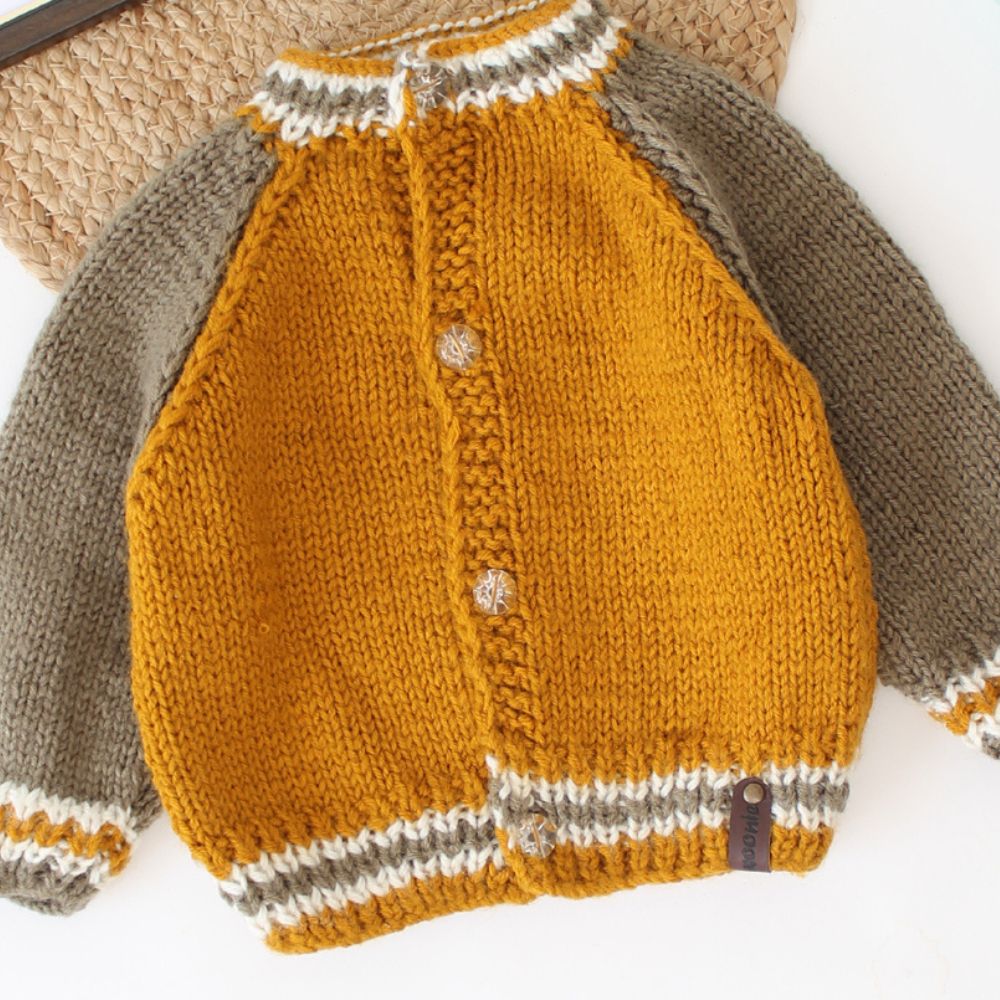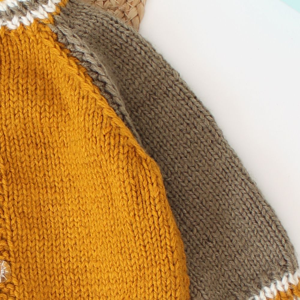 The sweater boasts a delightful combination of mustard yellow and grey hues. The mustard yellow dominates the body and cuffs, while the grey graces the sleeves and lower torso. The color contrast creates visual interest.Overall, it’s a cozy and stylish cardigan perfect for chilly days.
