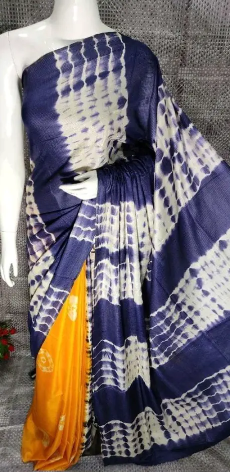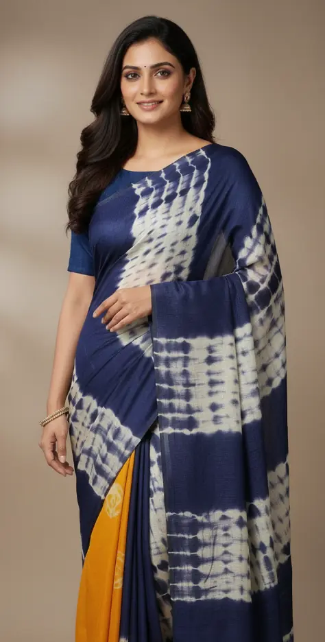 A classic handwoven tie & dye saree that pairs deep indigo tones with a pop of mustard for effortless everyday elegance.