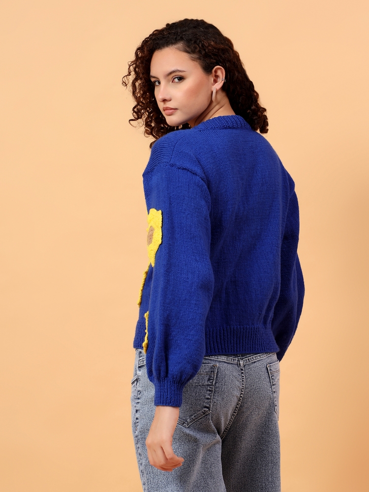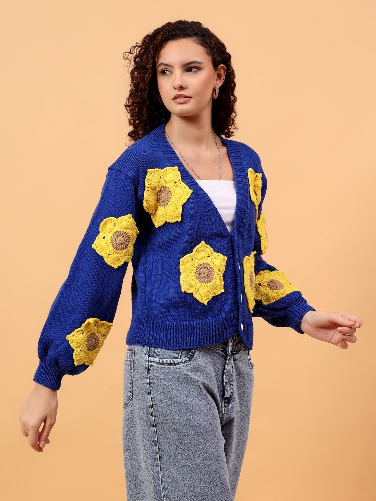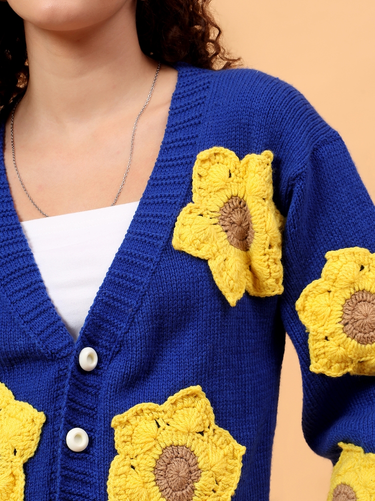 A vibrant hand-knitted blue cardigan highlighted with cheerful yellow floral motifs, crafted for warmth, comfort, and joyful style.