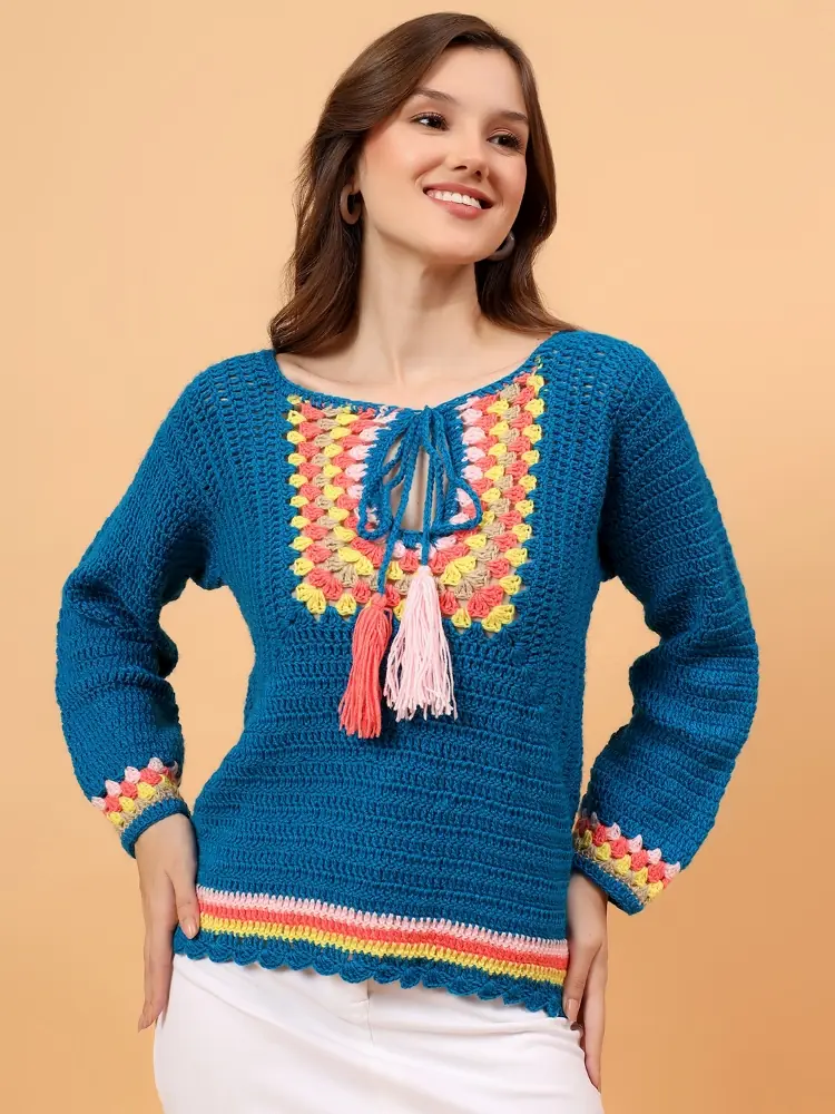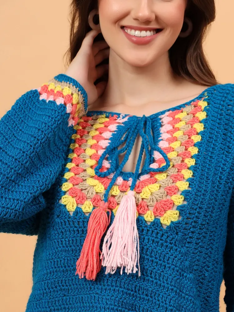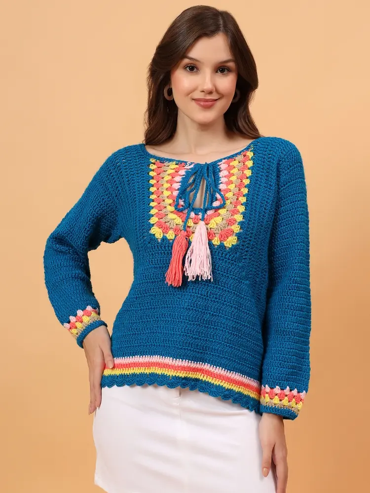 This hand-crocheted sweater is lovingly made by skilled artisans using traditional crochet techniques. The deep teal base is enhanced with a multicolour crochet yoke and tassel tie-up neckline, inspired by bohemian aesthetics. Soft, warm, and breathable, it’s perfect for winter layering and relaxed everyday styling.