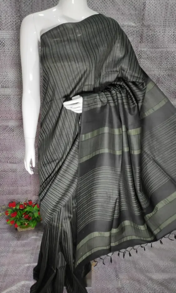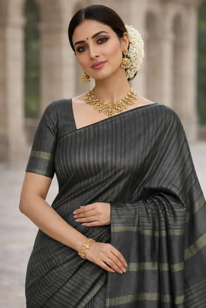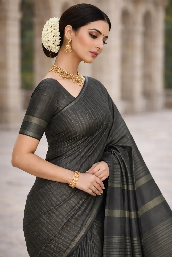 A graceful handwoven cotton saree in deep charcoal tones, created for understated elegance and all-day breathable comfort.
