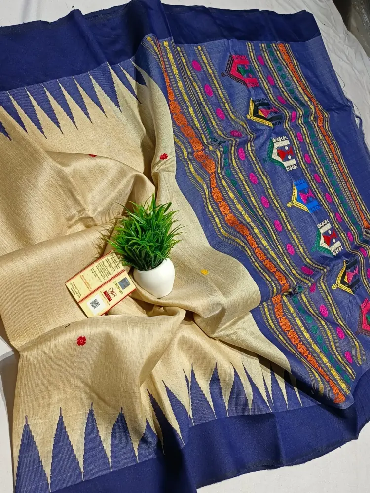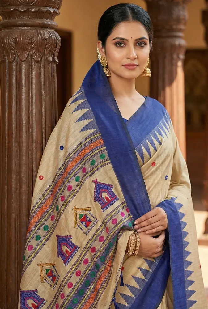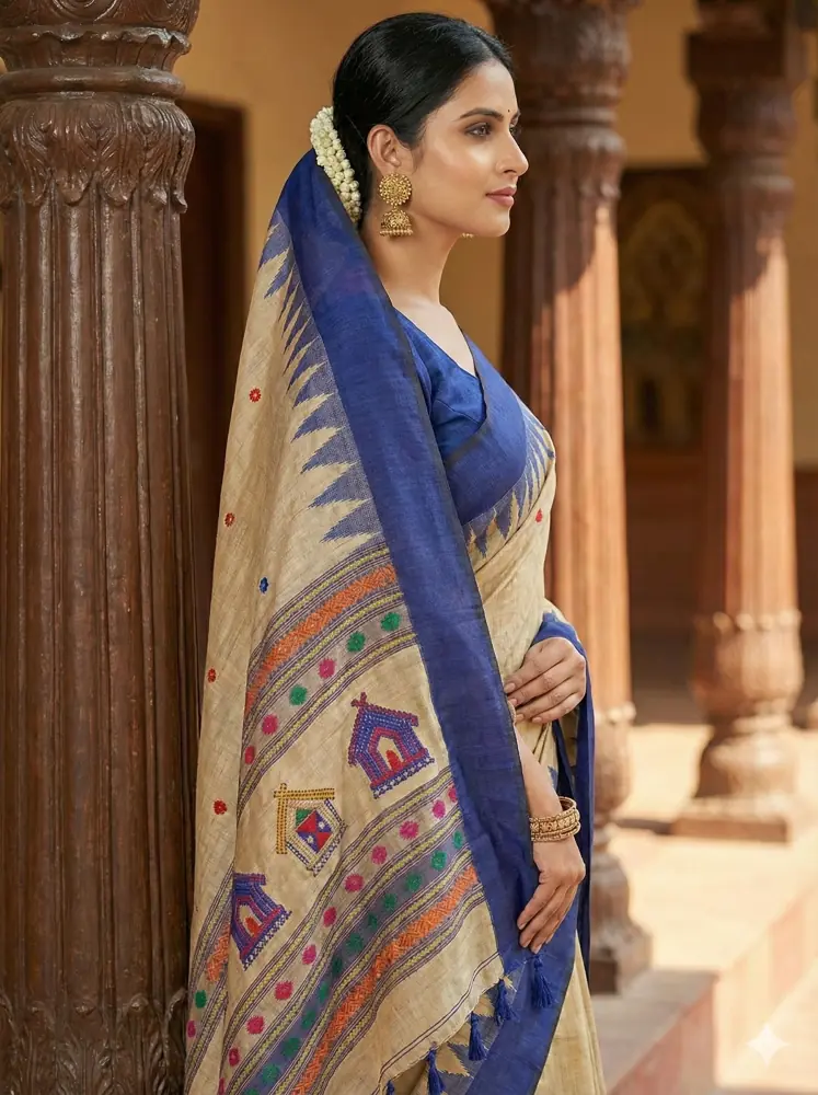 A graceful handloom tussar silk saree blending natural beige tones with a richly woven indigo blue tribal pallu.