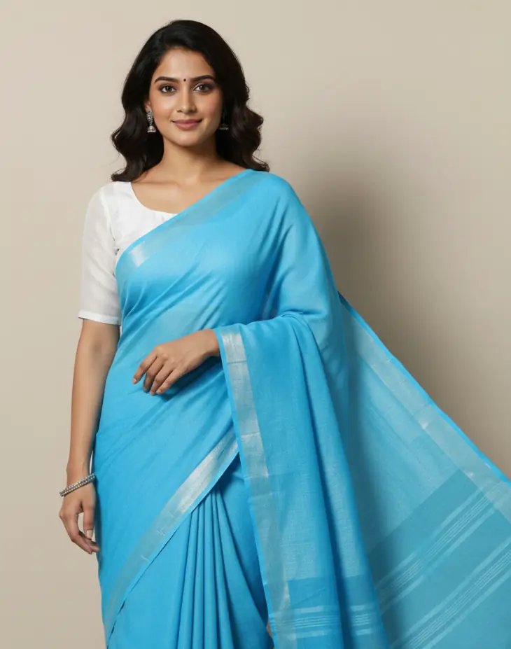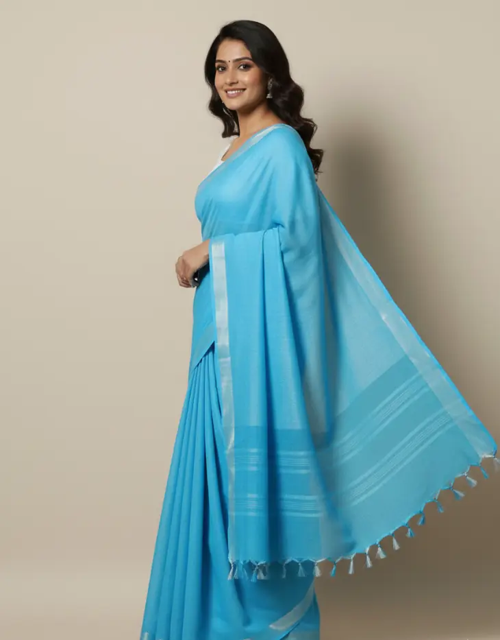 A soothing handwoven cotton saree in fresh sky blue, crafted for airy comfort and effortless everyday elegance.