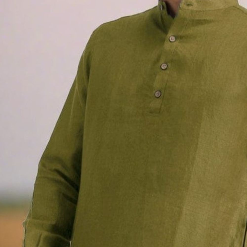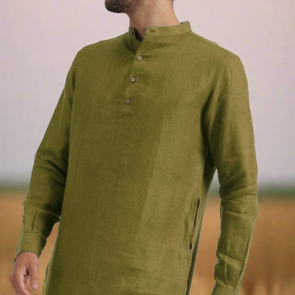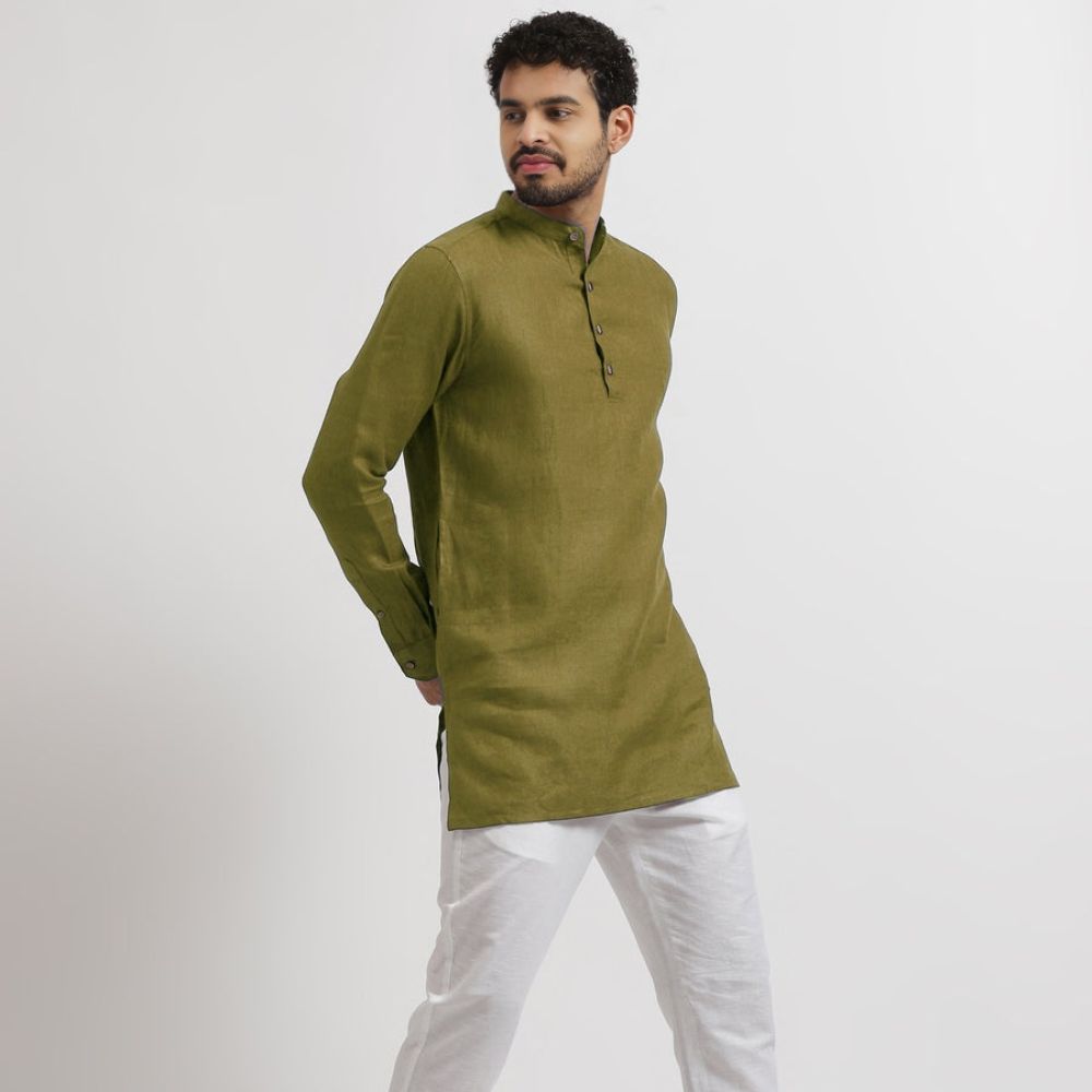 Refresh your wardrobe with this elegant olive green men’s linen kurta. Crafted from 100% linen, this kurta combines comfort and style, making it an ideal choice for various occasions.
