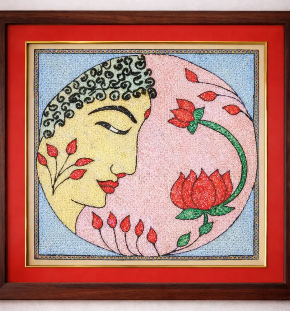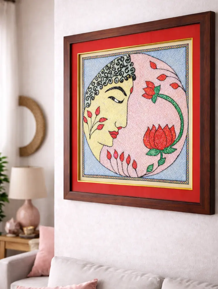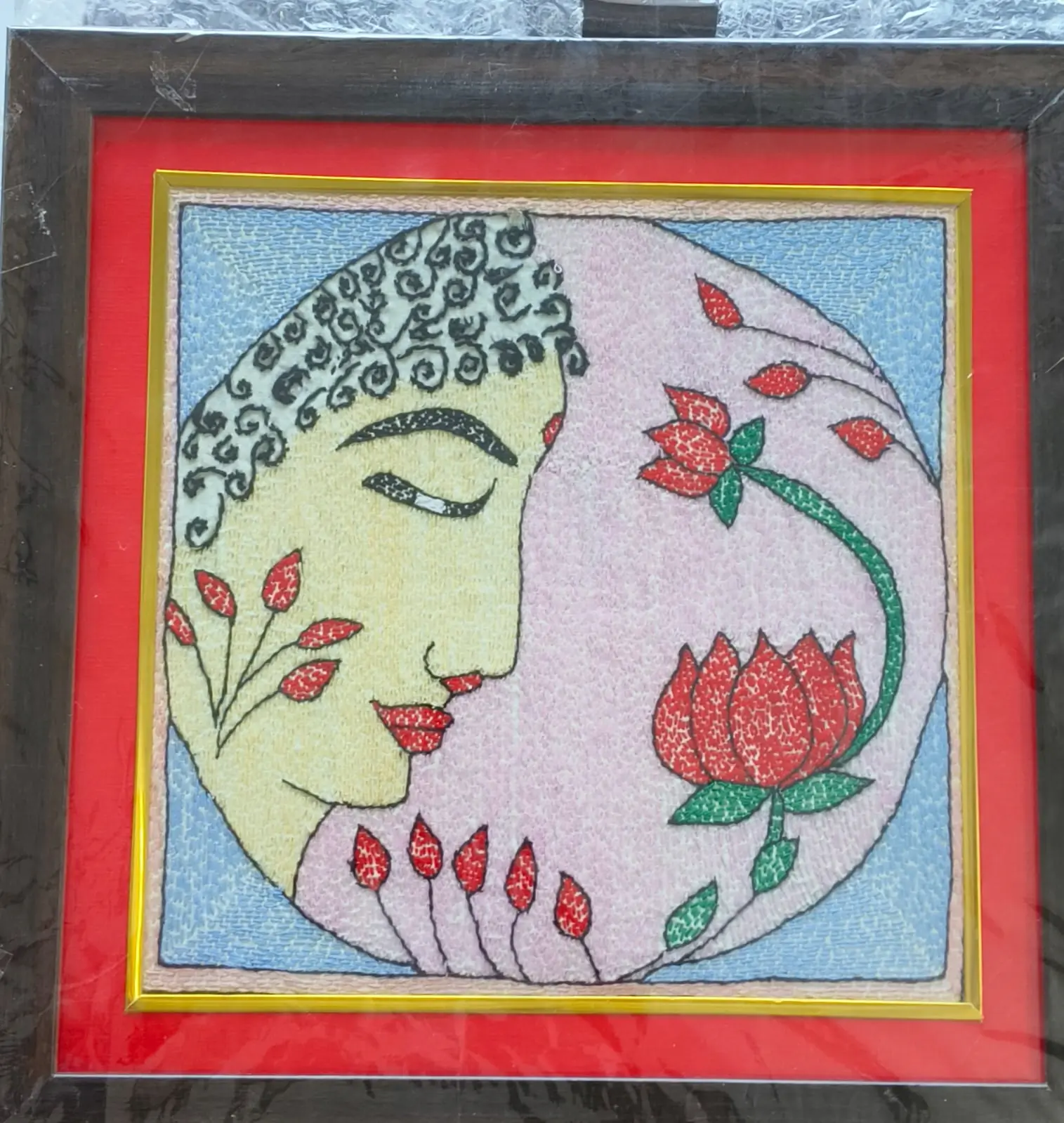 This framed Sujani painting is handcrafted by artisans from Bihar using traditional embroidery techniques. Featuring a serene feminine face alongside a blossoming lotus, it symbolizes beauty, purity, and spiritual awakening. Each piece is intricately hand-stitched on fabric and set in a premium wooden frame, merging folk artistry with refined home décor.