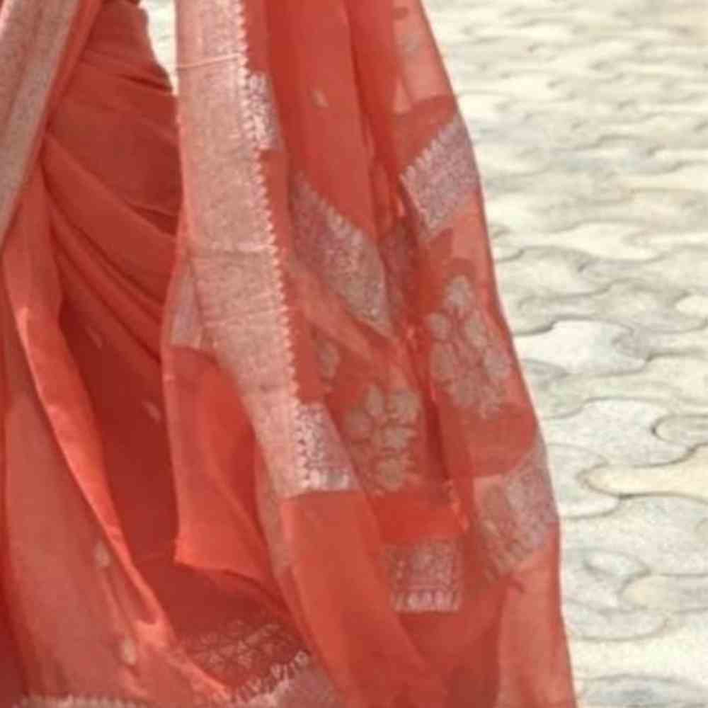 **Product Name:** Peach Georgette Chiffon Sareernrn**Description:**rnIntroducing our Peach Georgette Chiffon Saree, a graceful and ethereal ensemble that exudes feminine charm and elegance. Crafted from premium georgette chiffon fabric, this saree features a soft and delicate peach hue, creating a subtle yet enchanting look.rnrnThe lightweight and flowing georgette chiffon fabric drapes beautifully,
