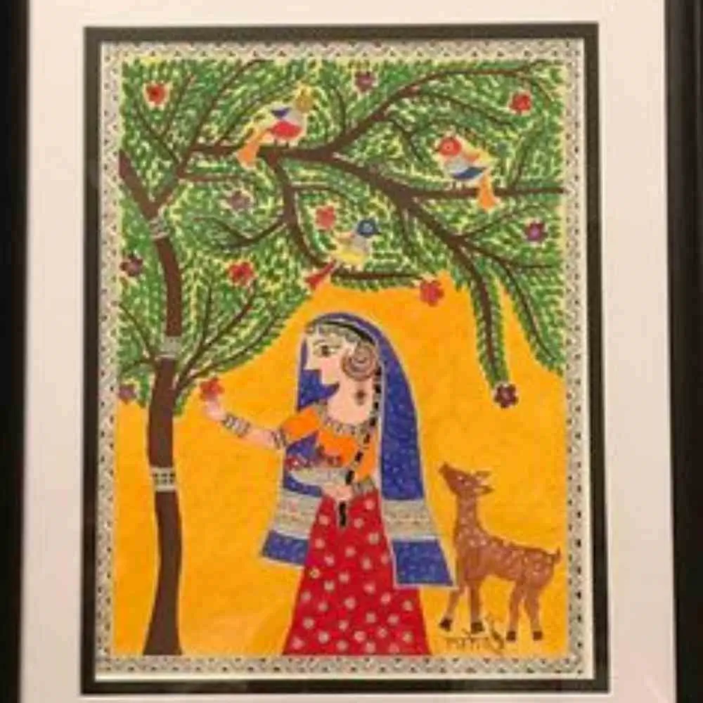 Rooted in the rich traditions of Mithila art, this handcrafted Madhubani painting portrays a graceful village woman beneath a fruit-laden tree, accompanied by birds and a gentle deer. The radiant mustard-yellow background enhances the symbolism of abundance, prosperity, and the deep connection between humans and nature.