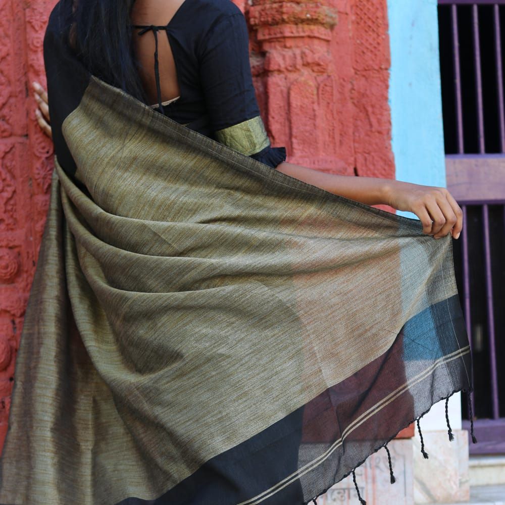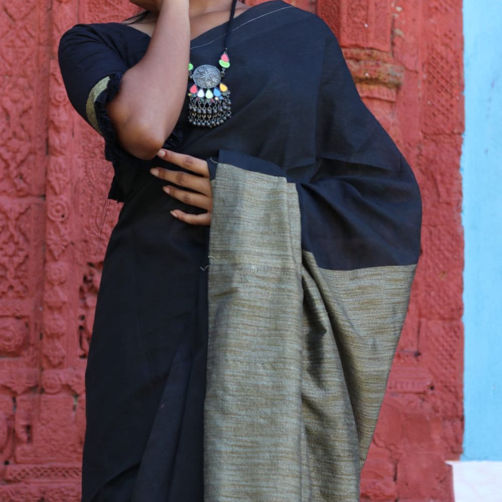 This classic black saree, paired with an elegant golden aanchal, is a statement piece that blends traditional charm with modern sophistication. The plain black body offers a sleek and versatile look, while the shimmering golden aanchal adds a touch of opulence, making it perfect for festive occasions, evening events, or formal gatherings. Handwoven with precision, this saree ensures comfort and style in equal measure.