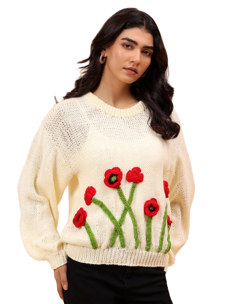 A graceful hand-knitted cream sweater adorned with blooming red floral motifs, crafted for cozy warmth and timeless elegance.