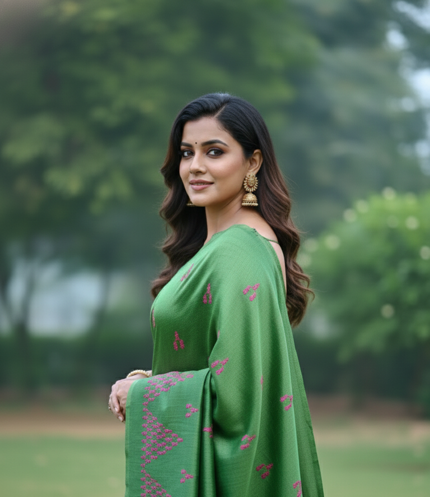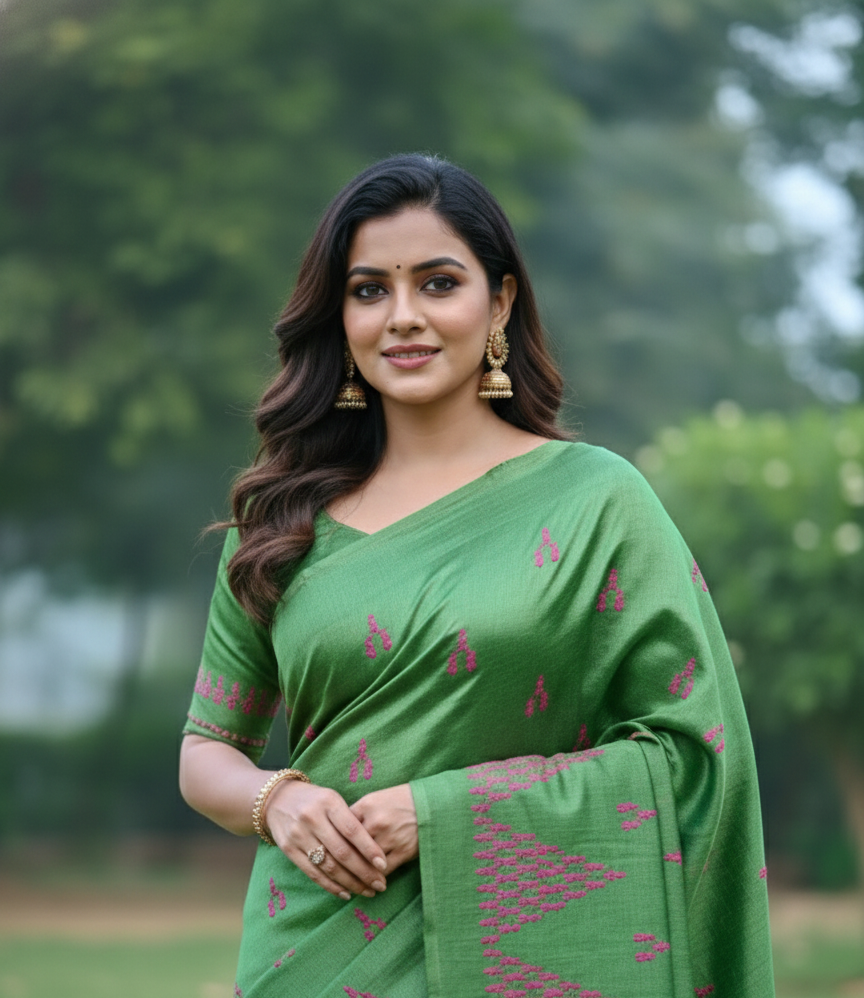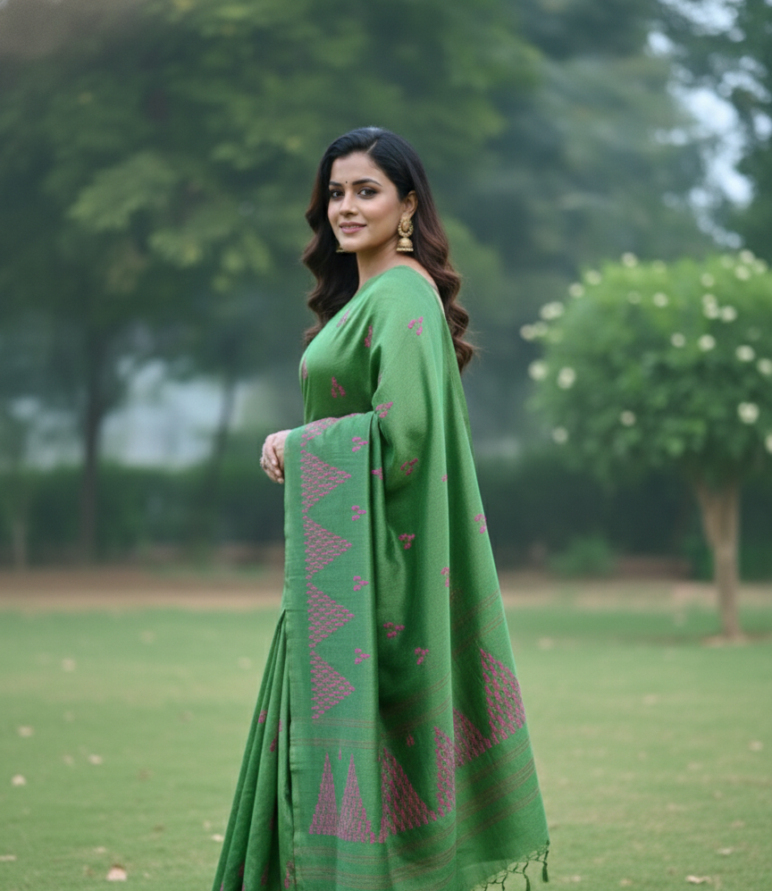 This handwoven Kosa silk saree is carefully crafted by skilled artisans using traditional handloom techniques. The rich green body is enhanced with delicate pink geometric and dotted motifs that add quiet charm. Lightweight, breathable, and naturally textured, this saree reflects simplicity rooted in tradition, making it ideal for cultural gatherings and elegant day wear.