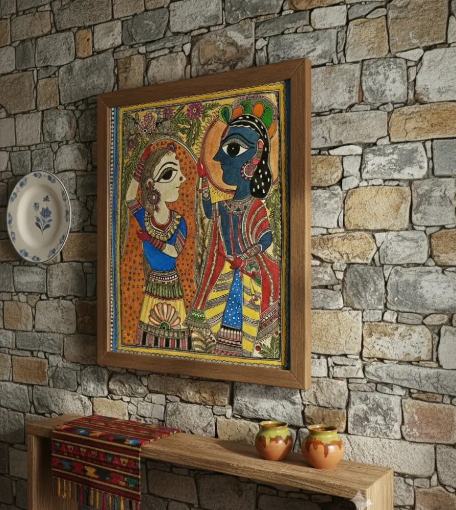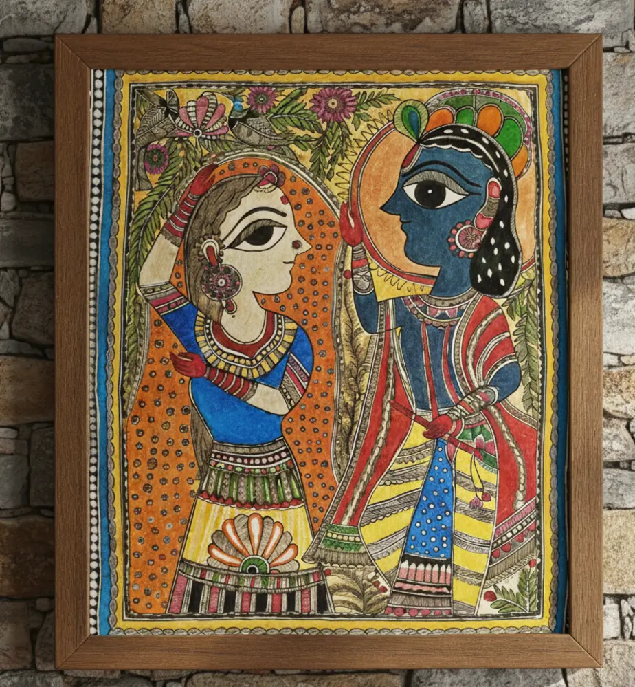 A vibrant Madhubani portrayal of Radha and Krishna, symbolizing eternal love and divine harmony.