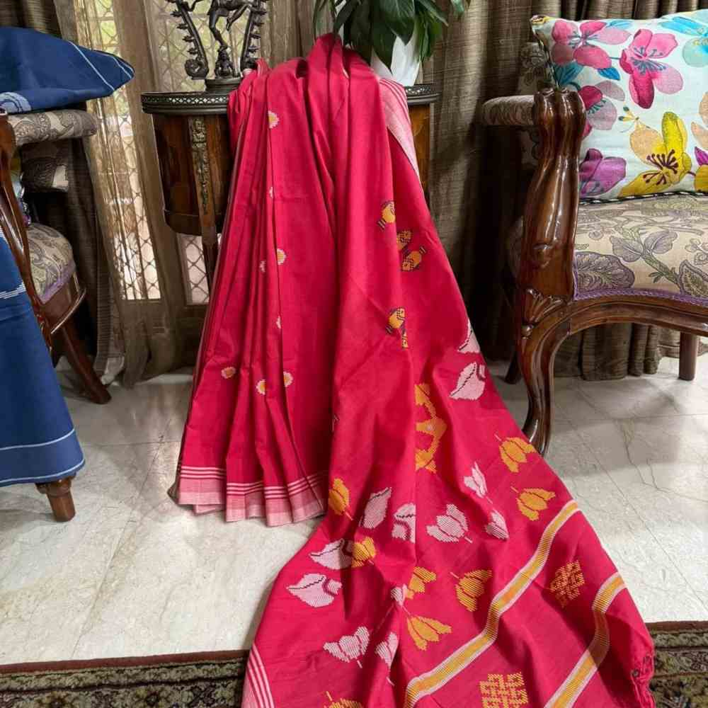 The Radiant Lotus Bawan Buti Saree is a breathtaking showcase of traditional artistry, intricately handwoven by skilled artisans from Bihar. This exquisite saree features a vibrant red base adorned with intricate motifs of lotus flowers, shanks, and blossoms, symbolizing purity, prosperity, and beauty. Each motif is meticulously crafted, creating a stunning visual tapestry that captures the essence of Indian heritage.