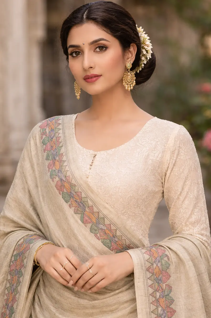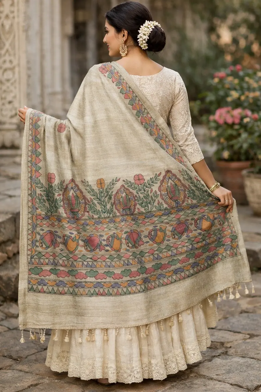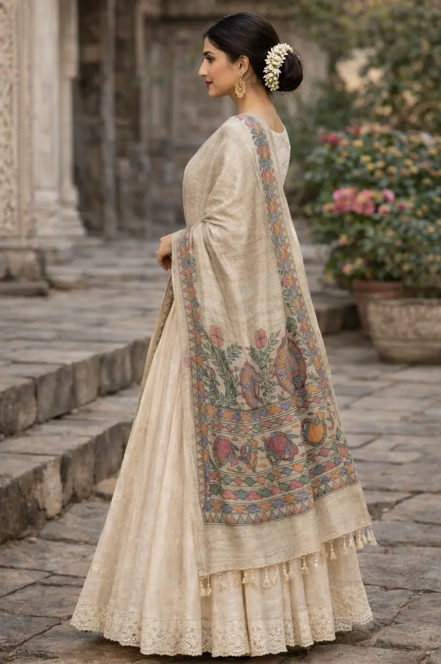 A regal Sand Beige dupatta enriched with intricate Mithila-inspired borders and timeless folk elegance.