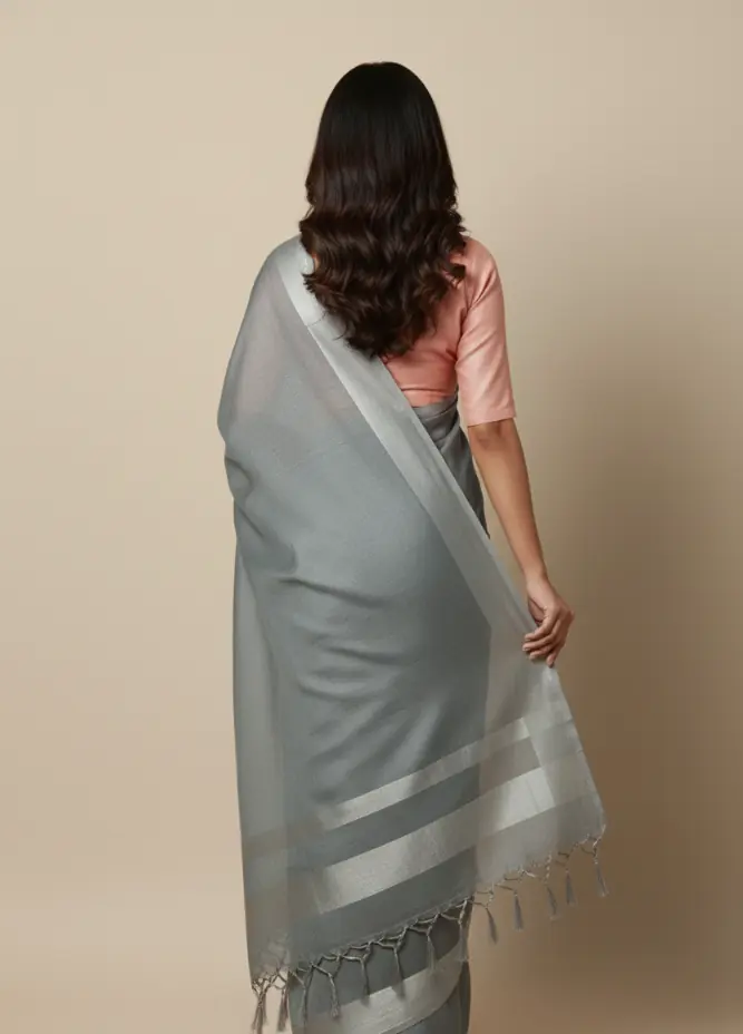 A refined handwoven cotton saree in soft silver-grey tones, designed for understated elegance and everyday comfort.