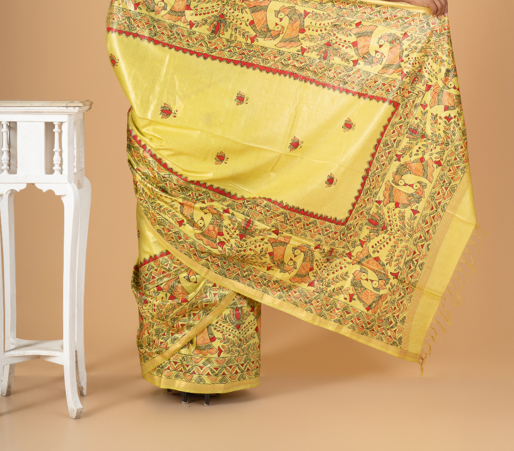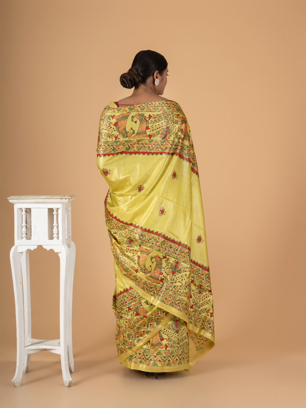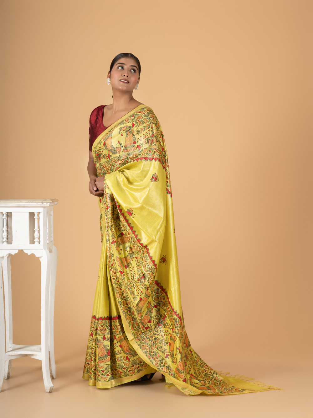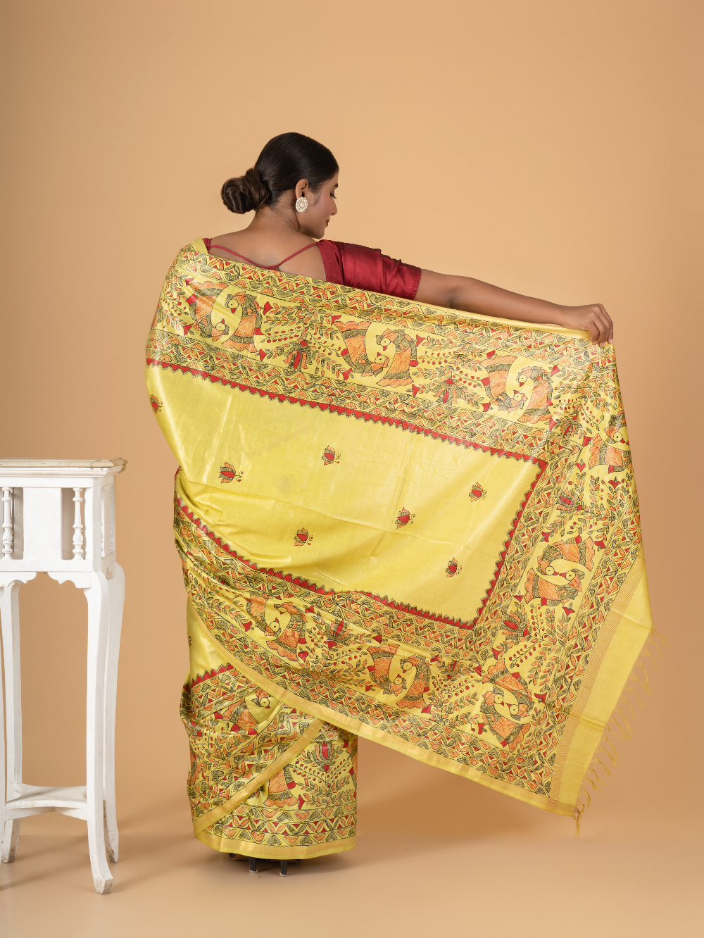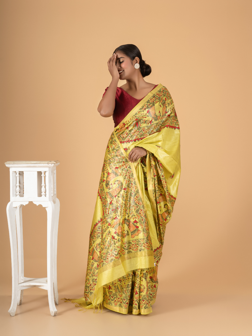 Rangrekha – Yellow Madhubani Hand-Painted Chaneri Silk Saree