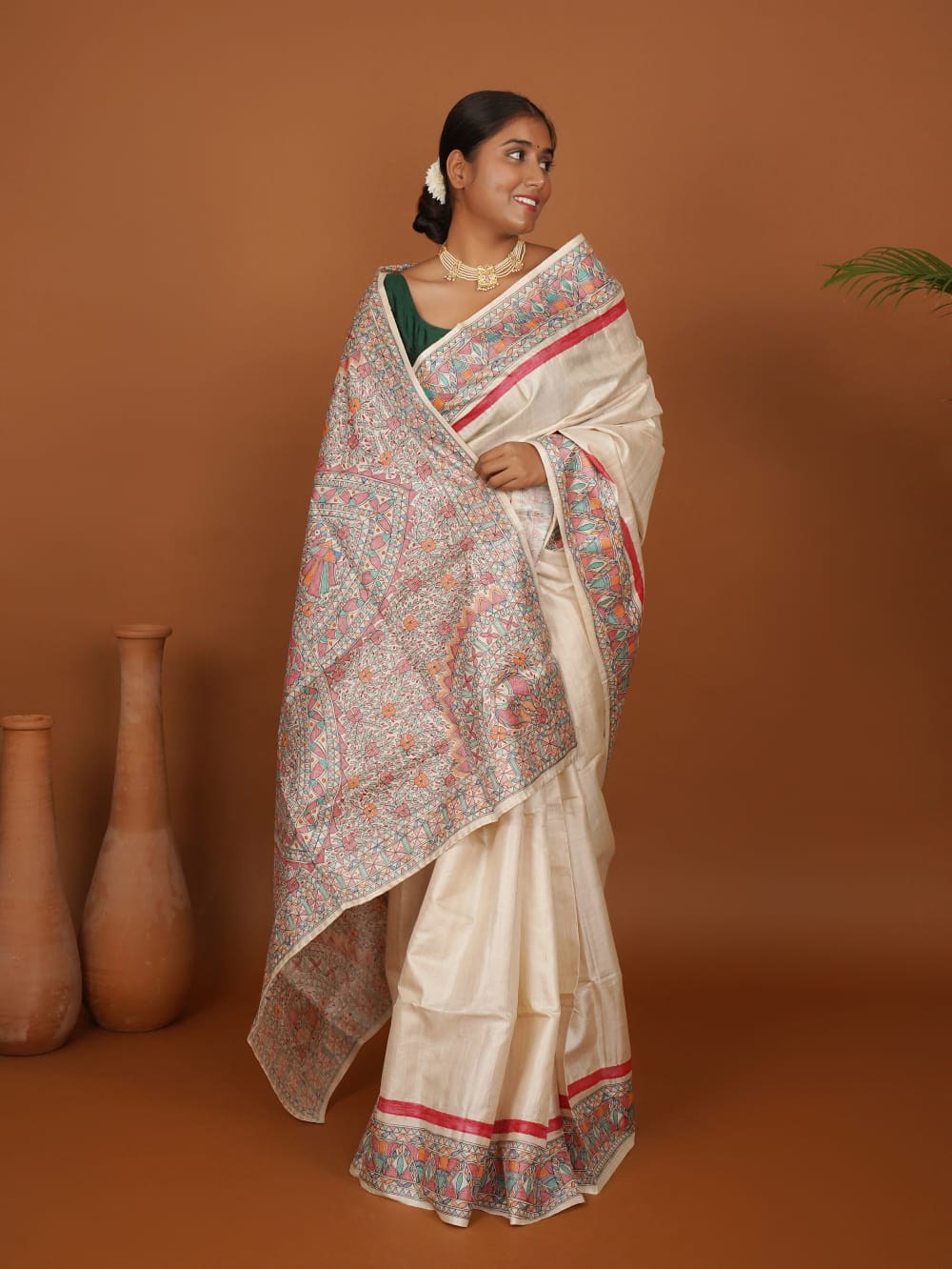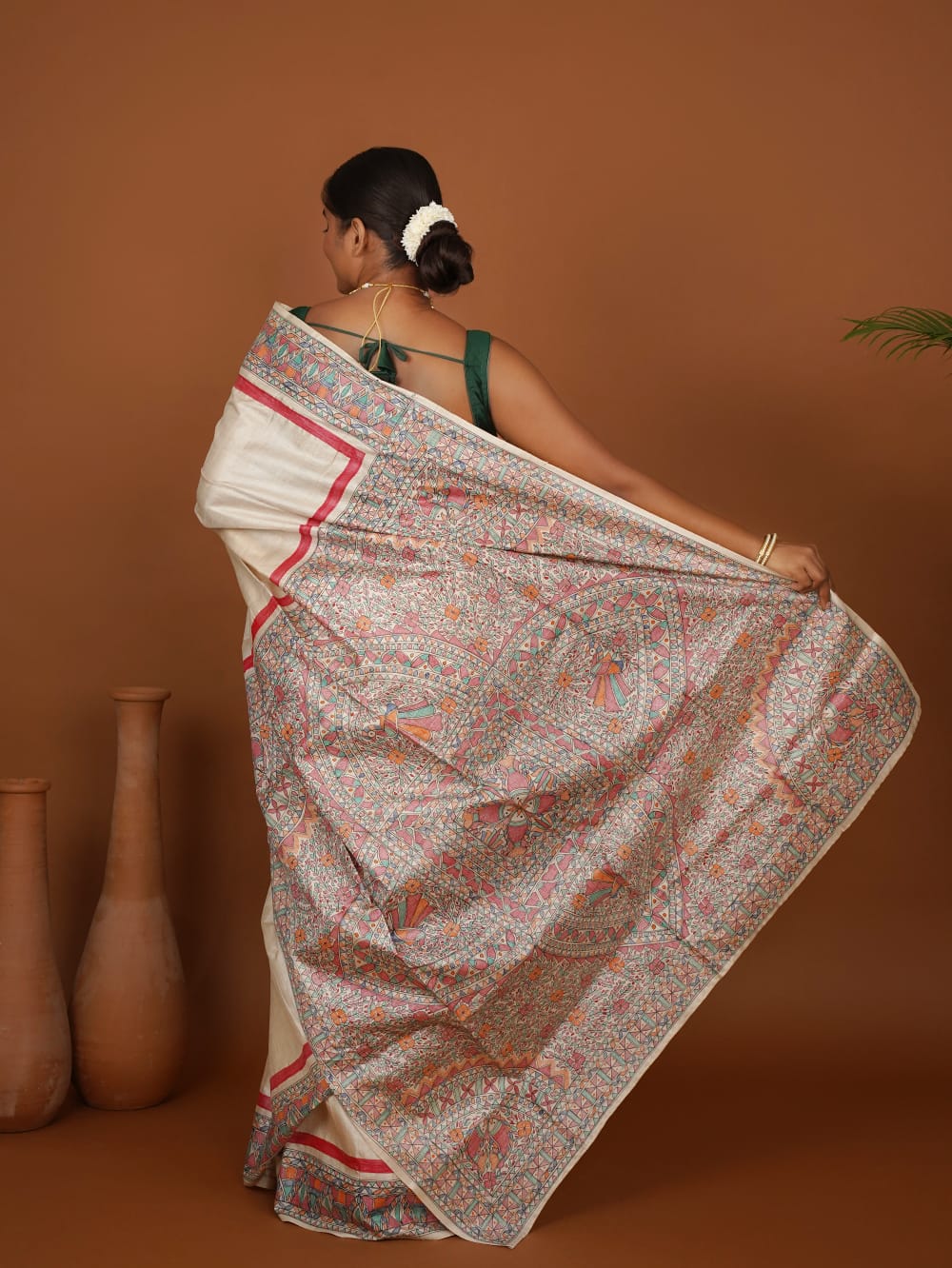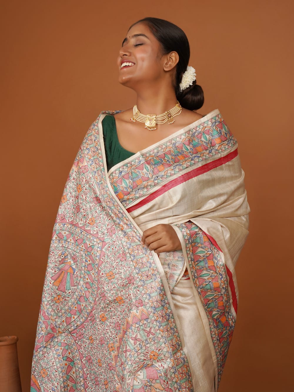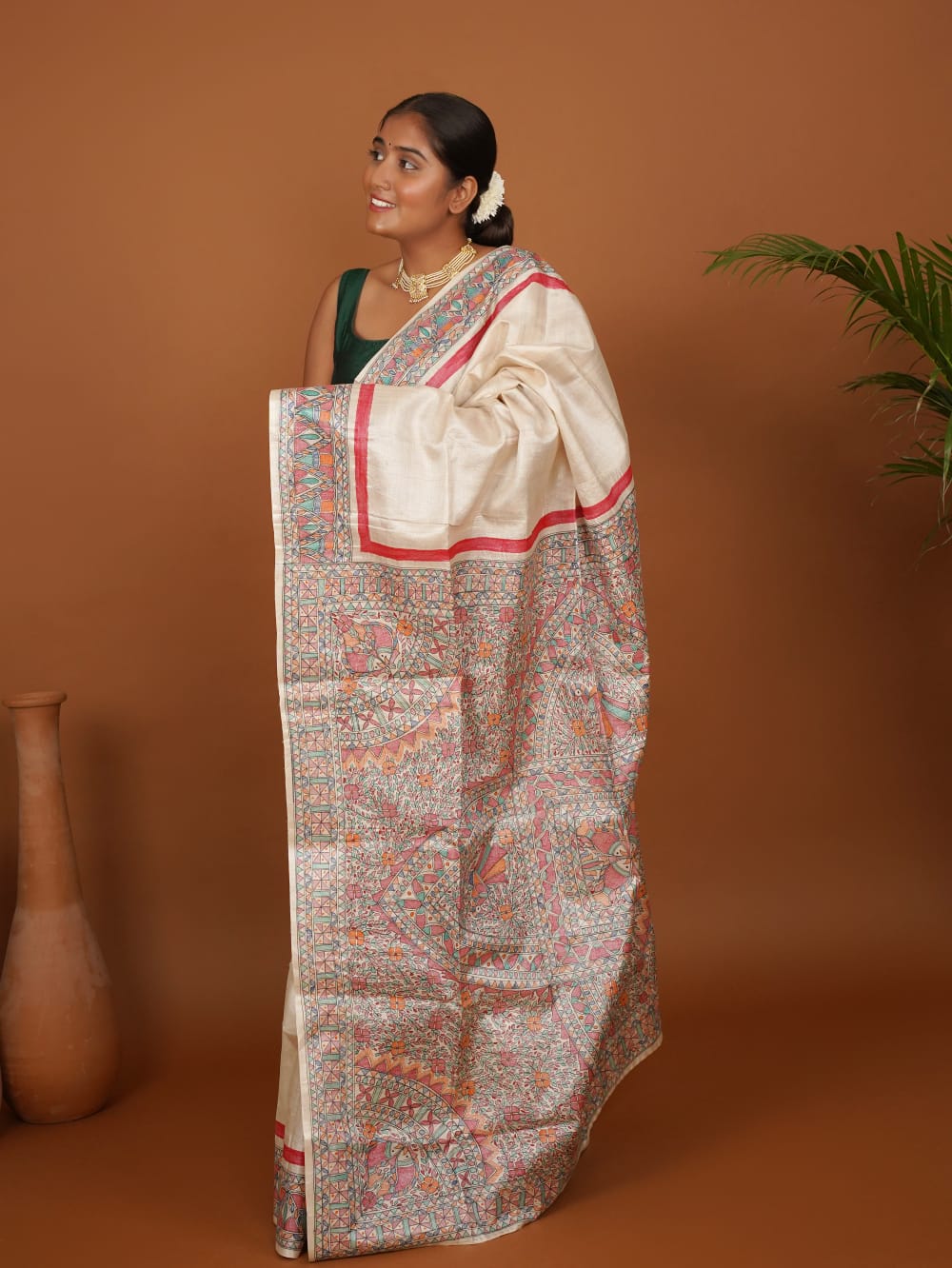 Rangvilas– Beige Tussar Silk Madhubani Handpainted Saree with Red Border Detailing