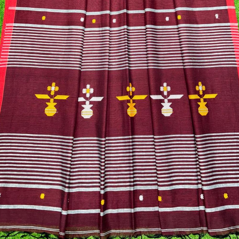 Rich maroon base adorned with intricate yellow and white Jamdani motifs.
