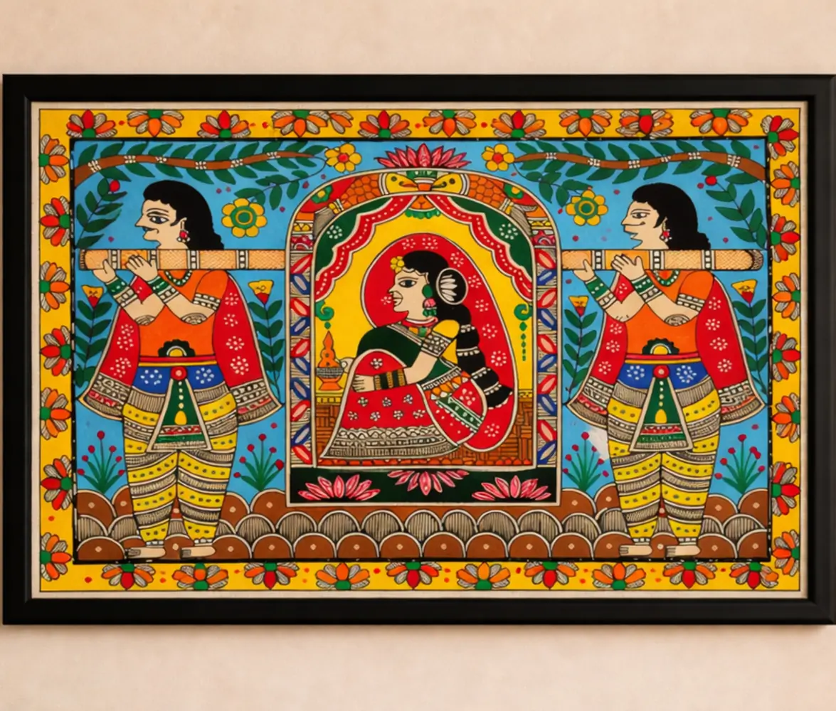 A vibrant Madhubani artwork celebrating love and music, beautifully framed in traditional folk storytelling style.