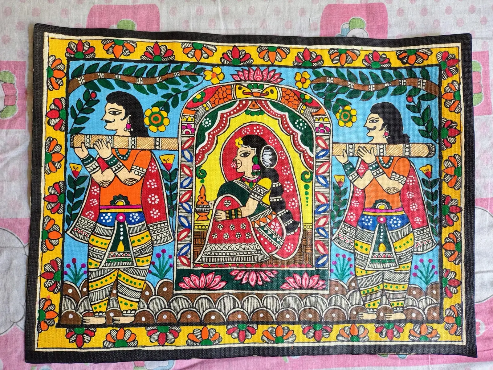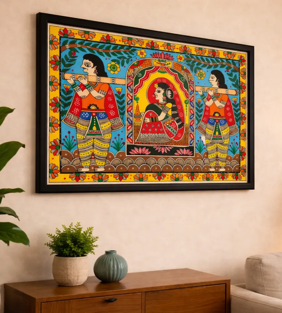This striking Madhubani painting captures a harmonious folk scene featuring a central couple surrounded by traditional musicians. Rich in symmetry, colors, and intricate detailing, the artwork reflects the essence of Indian cultural celebrations and storytelling, making it a perfect centerpiece for elegant home décor.