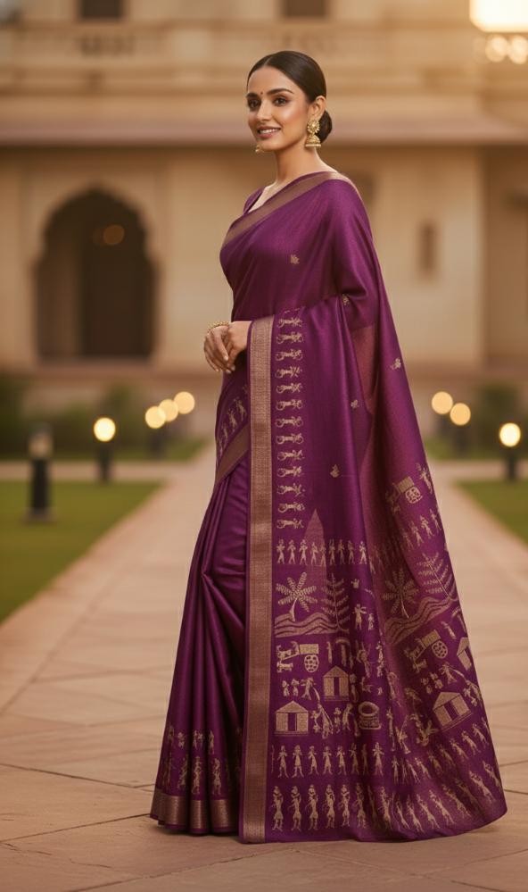 This handwoven Kosa silk saree is created by skilled artisans using traditional handloom techniques. The rich purple body is beautifully complemented by a finely woven pallu and border featuring narrative folk motifs inspired by rural life and culture. Naturally breathable with a soft silk sheen, it is ideal for celebrations, weddings, and cultural evenings