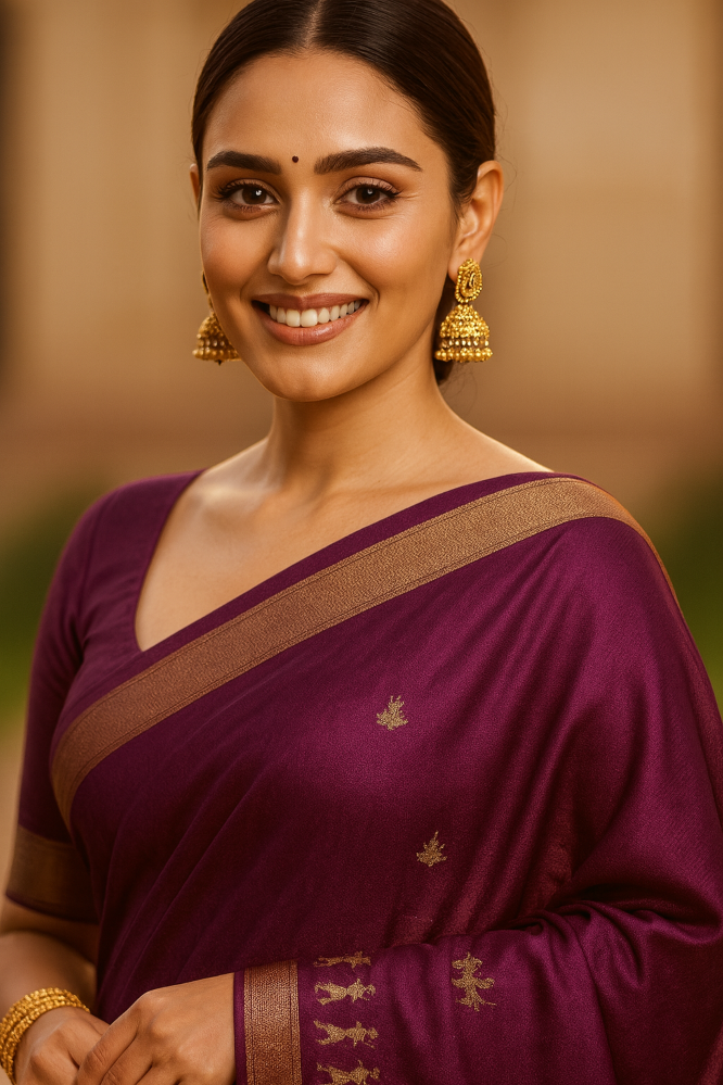 A regal handwoven Kosa silk saree in deep royal purple, adorned with heritage-inspired motifs for timeless festive elegance.