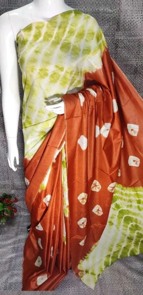 A refreshing handwoven tie & dye saree that pairs soft earthy greens with warm rust tones for effortless everyday grace.