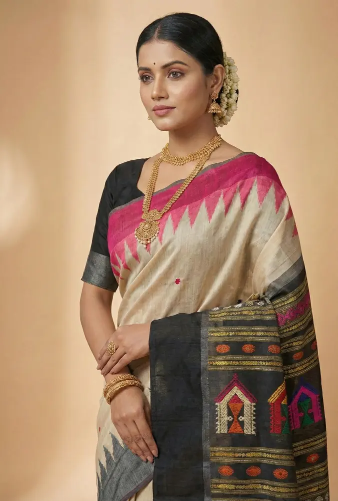 A timeless handwoven Tussar silk saree that balances soft elegance with bold geometric artistry for refined festive and cultural wear.