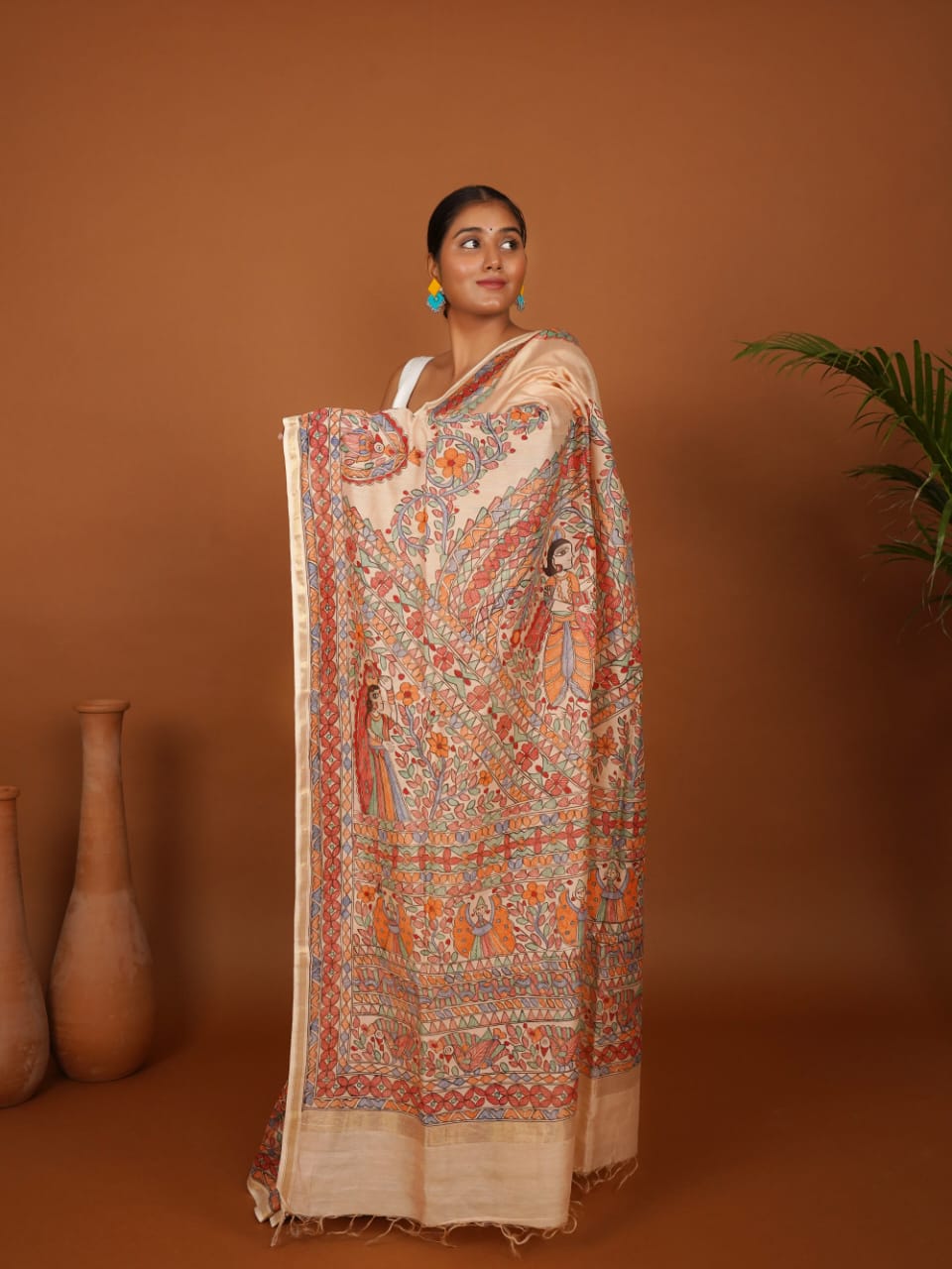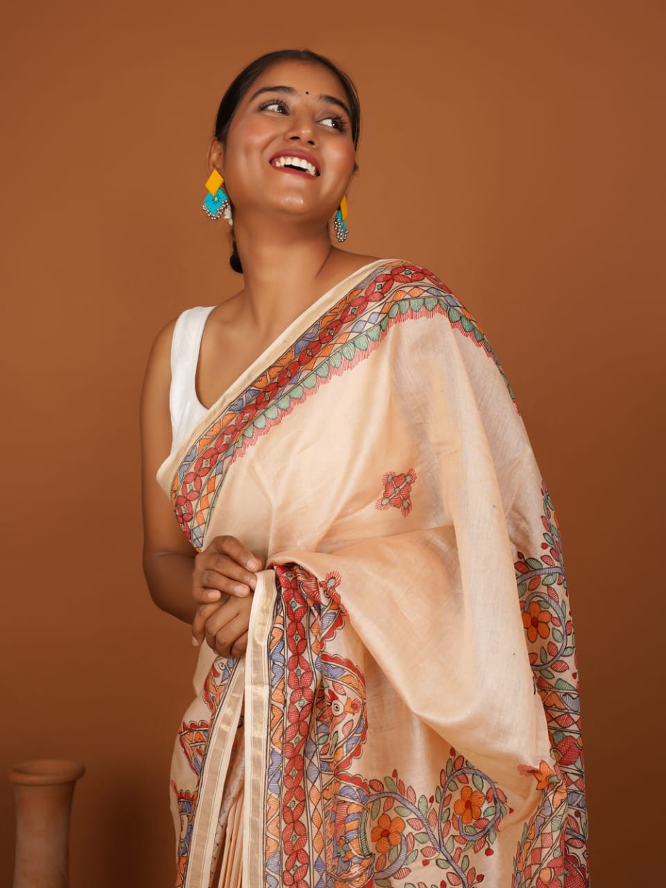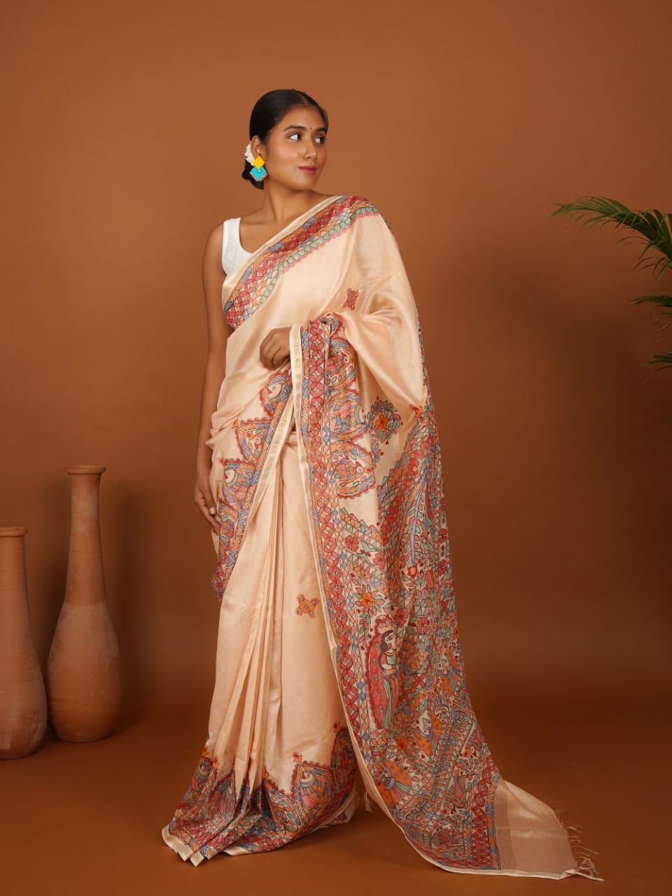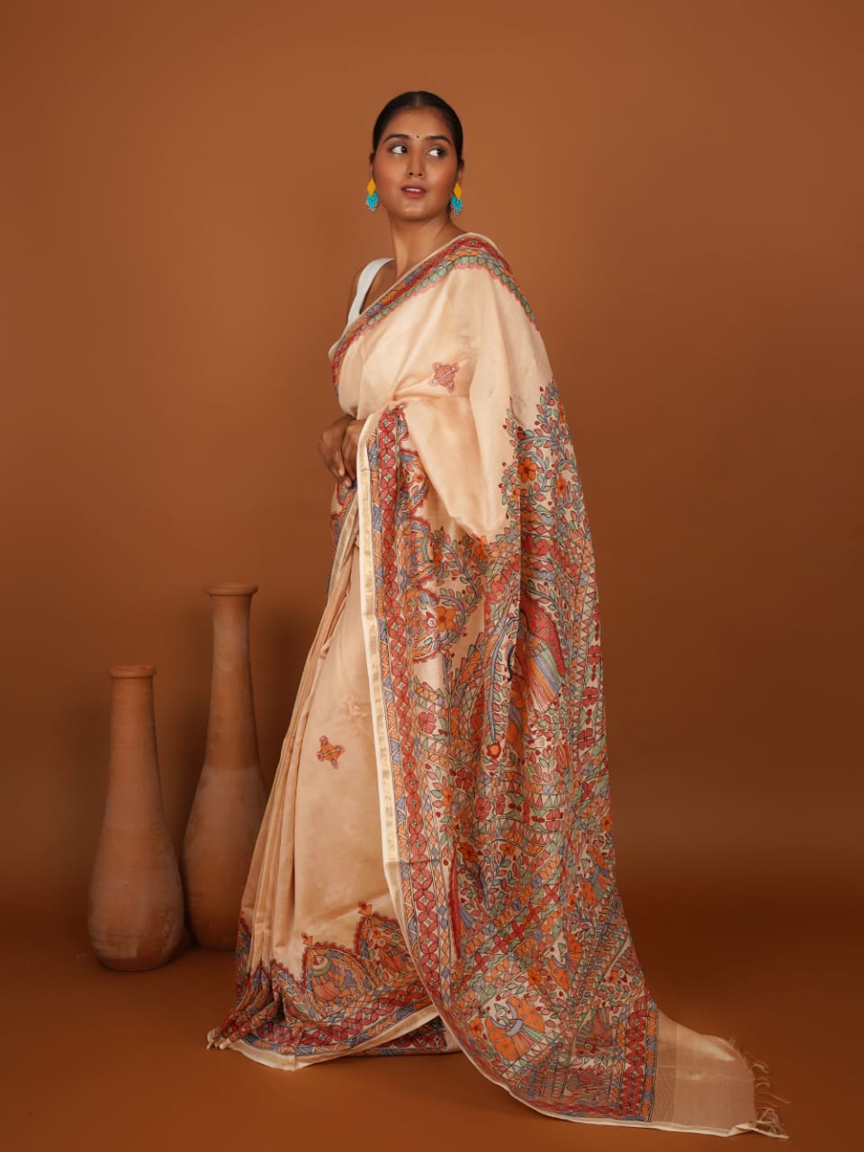 Shaadi Rang Saree – Peach Madhubani Painting Chanderi Cotton with Wedding Dance Aanchal and Bird Border