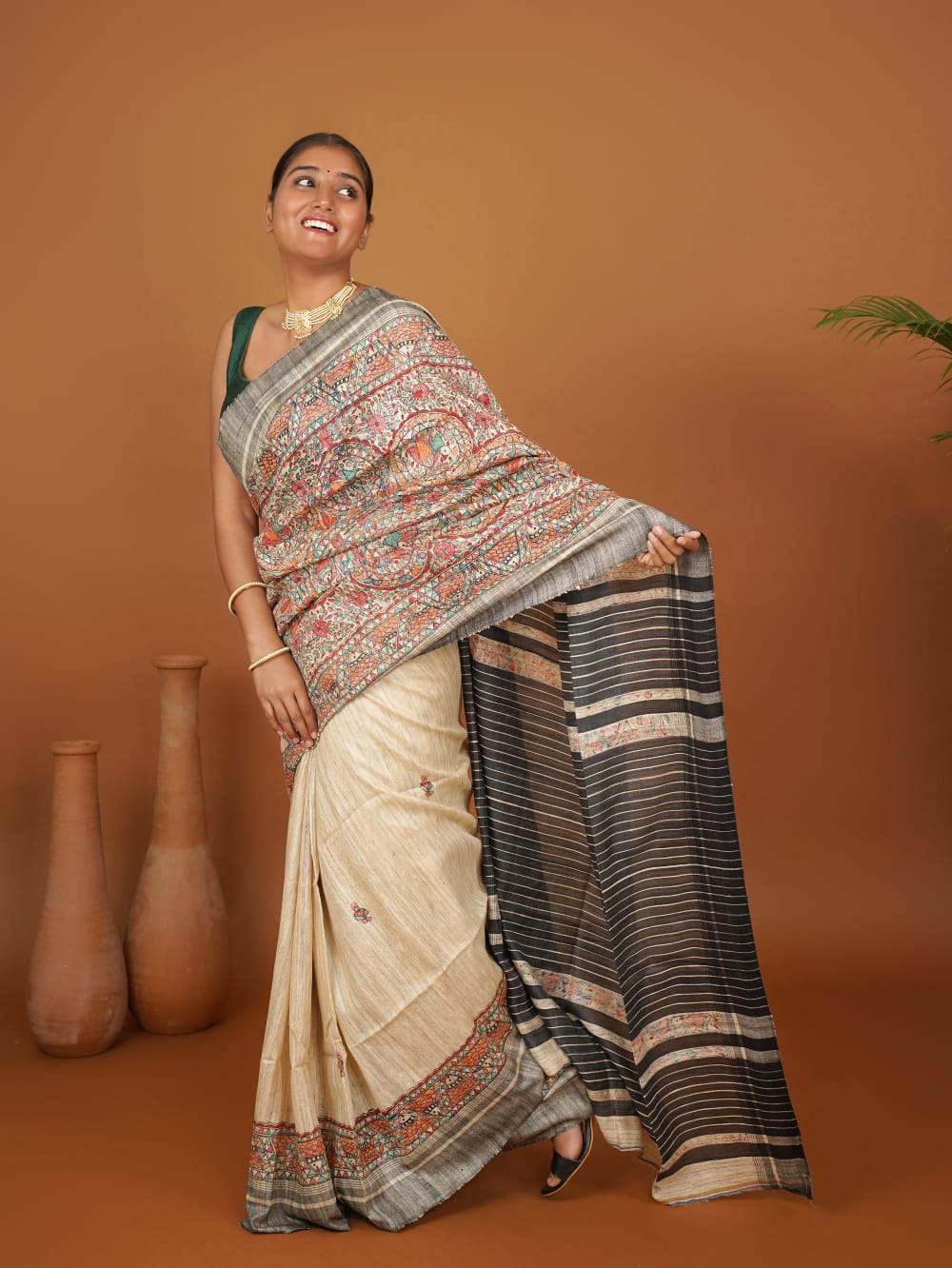Color: Natural Beige Body with Black Pallu and Multicolor Madhubani Artwork
